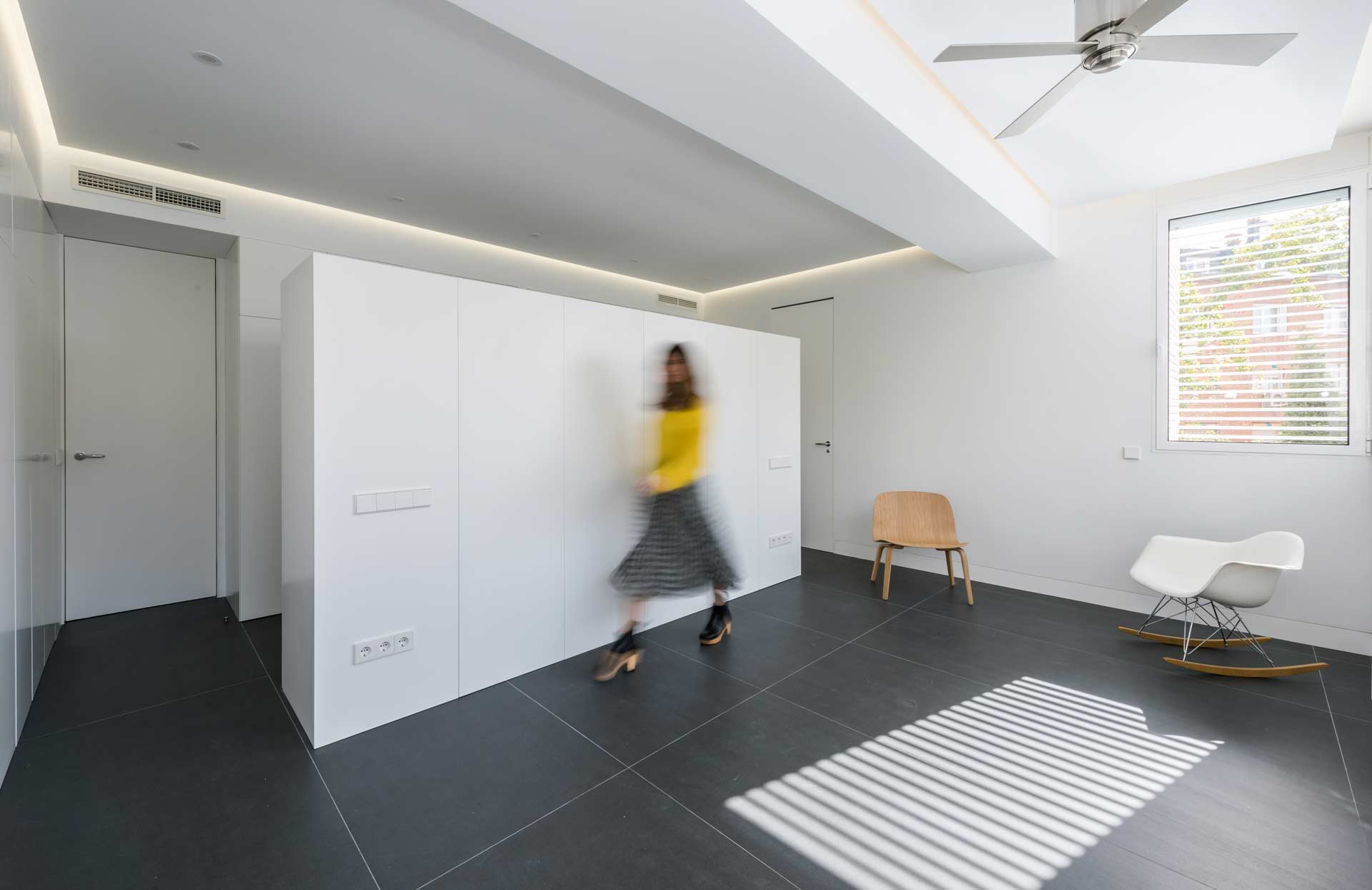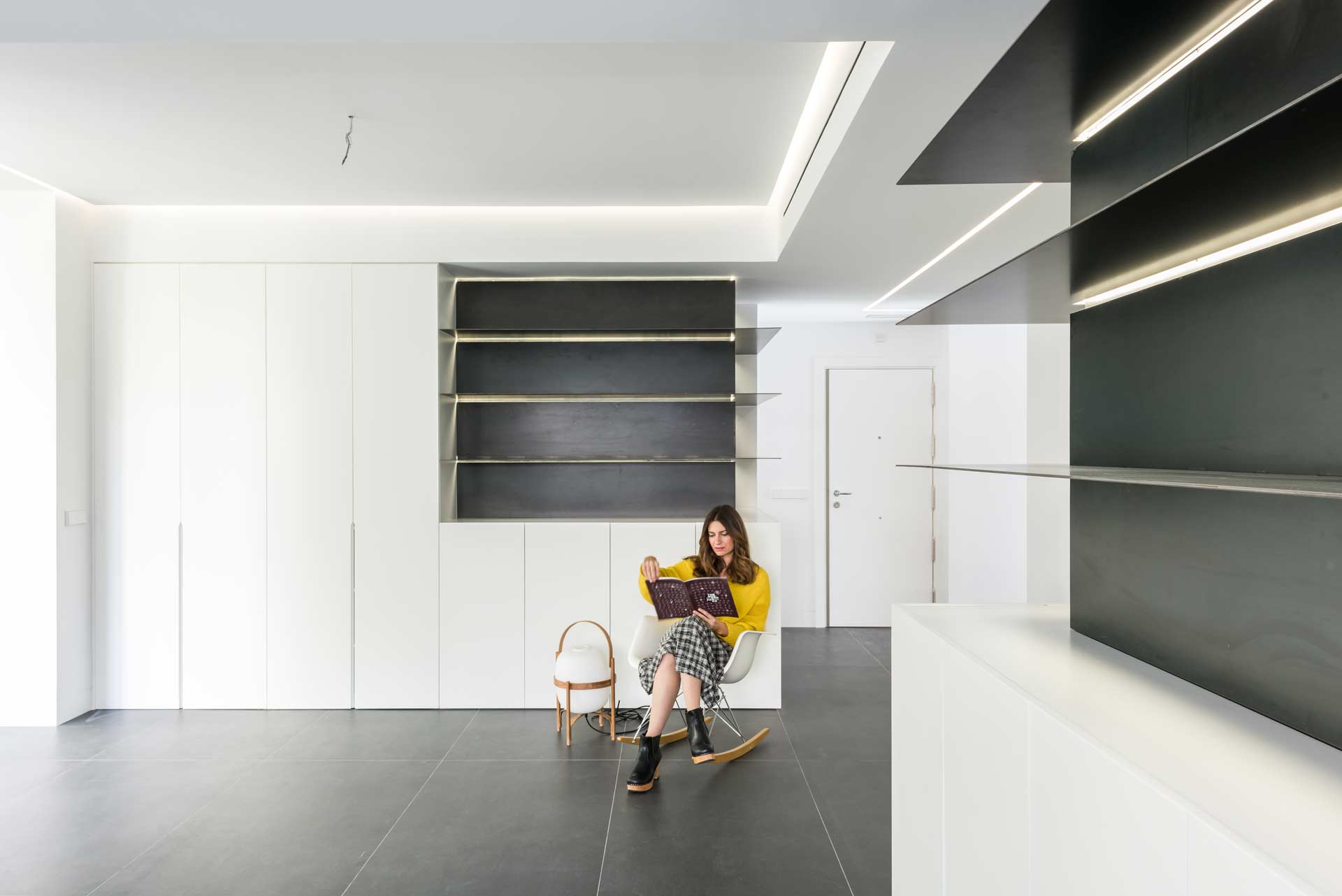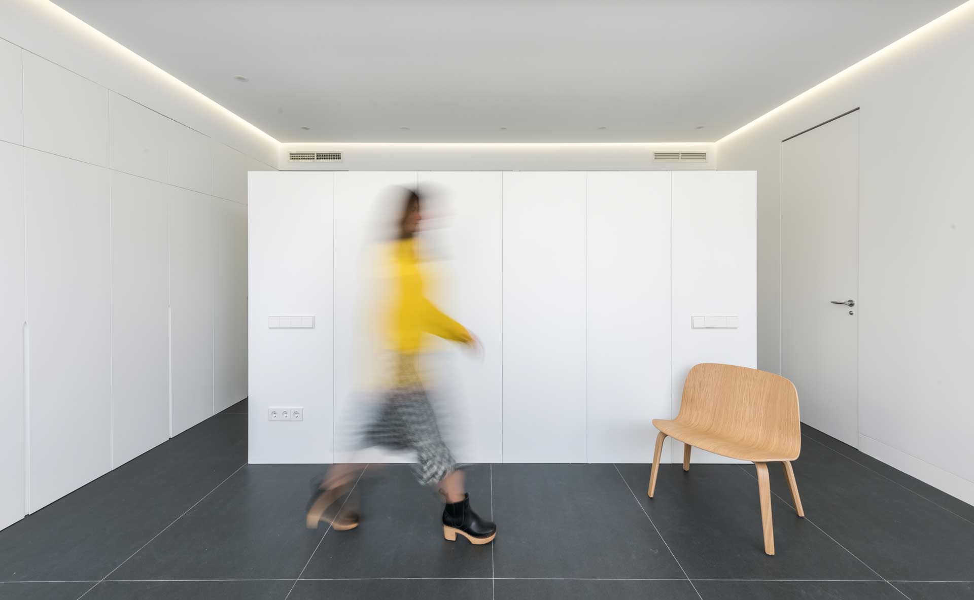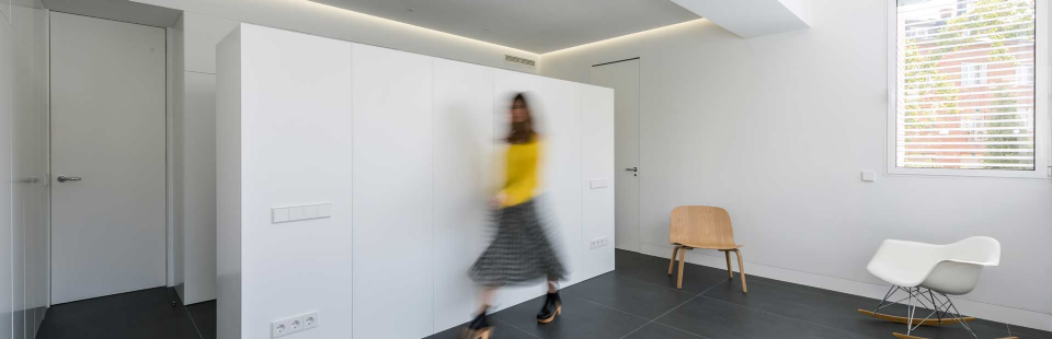 Si chiama Casa Jiloca come la Comarca del Jiloca, attraversata dall'omonimo fiume che scorre nella parte centro orientale della Spagna e nel suo DNA, oltreché nel nome, c'è sicuramente una connotazione culturale. Fino al 2018, infatti, il suo aspetto era quello tipico delle case madrilene degli anni '70, le ”case figlie” dell'allora boom economico, in mattoni, lo stile di molti quartieri delle città spagnole. Un aspetto molto distante da quello che presenta oggi, alla luce del radicale restyling ad opera di Zooco Estudio. ”La riforma della casa è completa”, spiega Miguel Crespo Picot di Zooco Estudio ”poiché si tratta di una casa originale degli anni '70 in cui niente era stato toccato da allora, quindi è stato necessario un cambiamento radicale. L'obiettivo principale era quello di generare un'estetica senza tempo e neutra attraverso la continuità dei rivestimenti e dei toni utilizzati”. L'intera casa è pavimentata con piastrelle di ceramica di grande formato in tono scuro, le lastre di gres porcellanato Buildtech/ 2.0 effetto cemento di Florim, mentre le pareti bianche continue includono contenitori nascosti dietro i pannelli laccati bianchi lungo il suo percorso. Nella zona nobile della casa il ripostiglio, nella sua parte superiore, si trasforma in un sistema di mensole metalliche rifinite al grezzo e retroilluminate. Il colore scuro del pavimento (tonalità Coal TU) è stato scelto per creare un contrasto forte con le superfici verticali delle pareti e degli armadi in bianco candido, una soluzione stilistica forte ma anche intramontabile nel tempo. E anche il formato delle lastre (60x120 cm, 10 mm di spessore) risponde a criteri estetici, al desiderio di creare continuità tra gli spazi: ”I clienti volevano liberarsi completamente della casa precedente, tappeti, decorazioni, ecc. e volevano un pavimento neutro e facile da pulire, motivo per cui ci siamo orientati su questo prodotto”, precisa l'architetto Picot. Nella stessa direzione vanno anche le altre scelte inerenti all'interior: i rubinetti di Tres, gli arredi per il bagno di Avila Dos compatti e lineari, gli apparecchi per l'illuminazione di Faro Barcelona, icona del design spagnolo, e di Rovasi per gli esterni, i termoarredi di Irsap. Un omaggio al design e una ricercatezza del minimalismo chiaramente espressi in ogni intervento sia strutturale che negli arredi e nelle finiture. Ma anche un esplicito desiderio di versatilità, dichiarato principalmente nel ricorso a prodotti e oggetti a bassa manutenzione (come le stesse lastre in gres dei pavimenti) e nella presenza di molteplici elementi contenitivi per tutti gli ambienti.