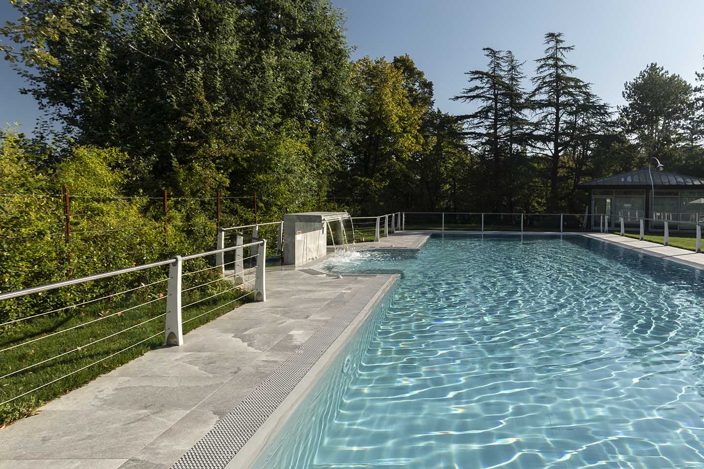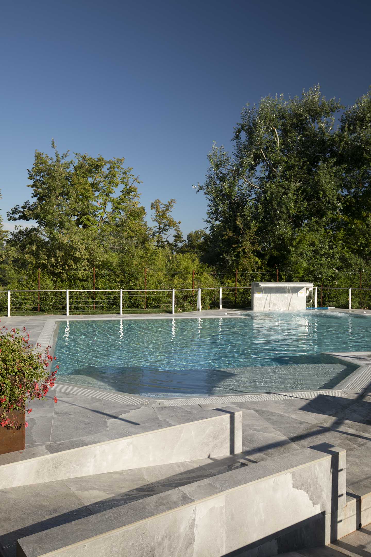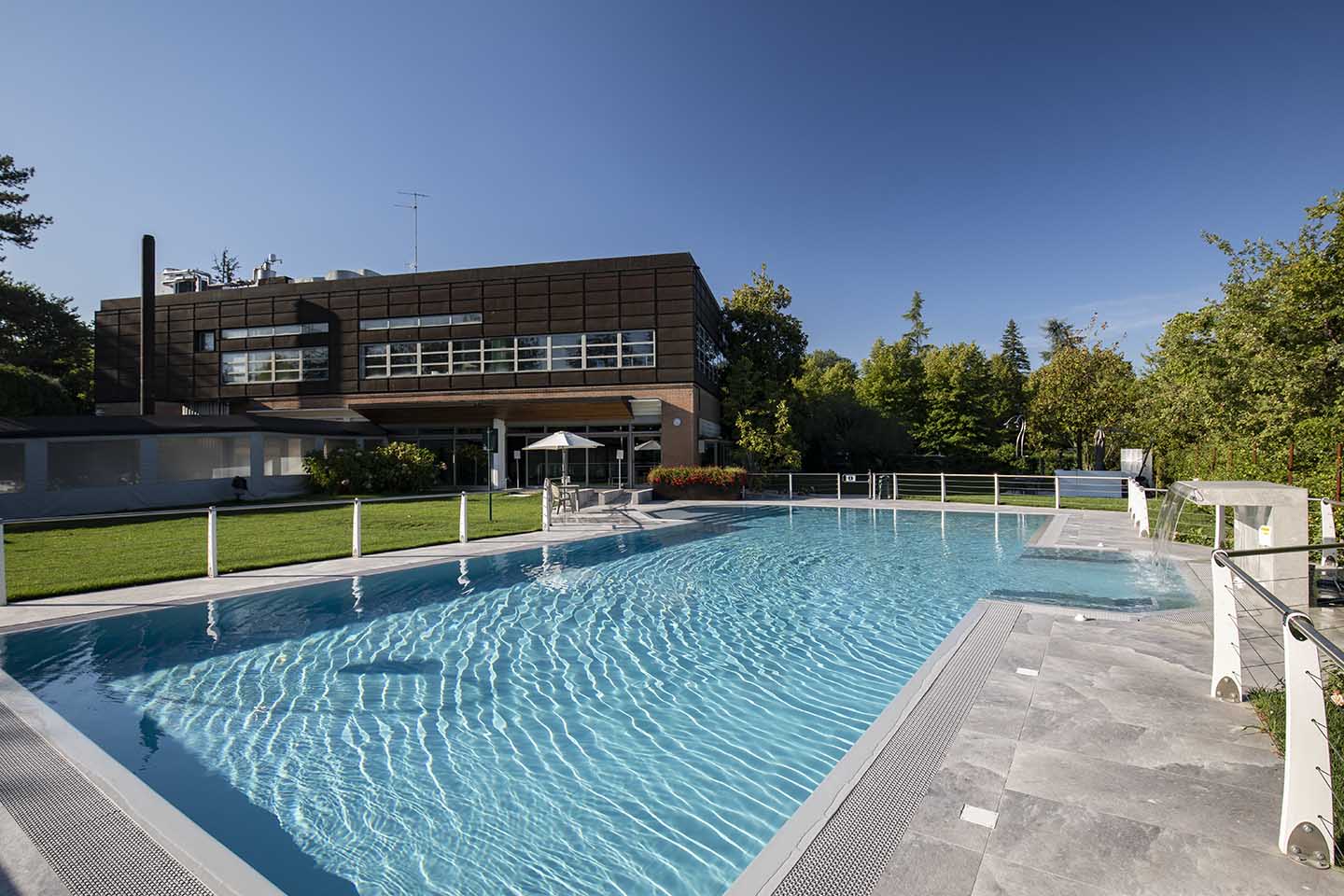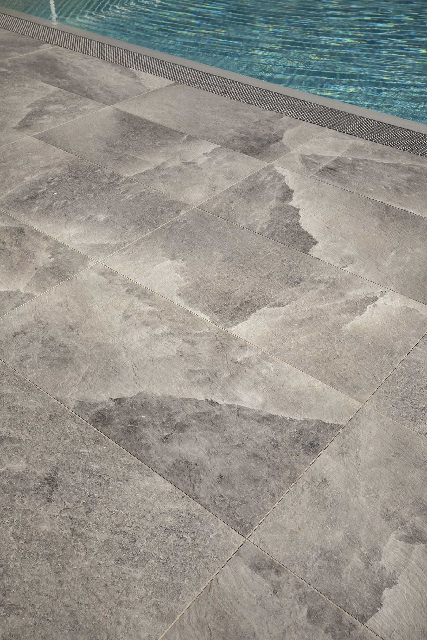 È notoriamente risaputo che il contatto con il sale produce numerosi benefici per il corpo, in genere aiuta ad espellere le tossine e migliora il funzionamento dei polmoni. Non solo, il contrasto cromatico tra le tonalità bianco-lucido del sale (sfumature di grigio, color salvia, tortora e sabbia) e il cielo produce un effetto estetico di rara bellezza, lo sa bene chi ha visitato paesaggi come il Salar di Uyuni, la pianura di sale in Bolivia. Paesaggi e ambienti naturali che hanno ispirato la nuova piscina del Centro Benessere Balnea, a Sassuolo in provincia di Modena, per la realizzazione della quale, sia all'interno della vasca che per la pavimentazione esterna, è stata scelta la linea di gres Rock Salt of Cerim di Florim (con moduli di 60x120 cm) ispirata proprio ai blocchi di sale che si estraggono dalle miniere. La texture del cristallo che cambia con le variazioni della luce naturale è un invito al contatto fisico, un'esperienza sensoriale che arricchisce la permanenza nella nuova piscina termale concepita proprio dai proprietari come un prolungamento della zona interna e allo stesso tempo come un momento di contatto estremamente fluido con la natura circostante: ”Le Terme della Salvarola sorgono su una verde collina ricca di vigneti a 3 km dal centro di Sassuolo. Le sue acque, si dice siano conosciute sin dai tempi dei Romani, utilizzate da Matilde di Canossa e chiamate divine dagli Estensi. Le Terme nacquero verso la fine dell'800 e rimasero aperte fino alla prima guerra mondiale. La famiglia degli attuali proprietari le riaprì nel 1958”, spiega il geometra Ercole Leonardi, titolare del centro, nonché ideatore del progetto della nuova piscina termale insieme all'azienda Bluezone che ha curato la costruzione dell'opera. ”Abbiamo sentito la necessità di una piscina termale estiva per elevare ulteriormente la qualità e la quantità dei servizi tutto l'anno e rendere più piacevole e confortevole il soggiorno termale, turistico, di business e sportivo”, precisa il geometra. La piscina è ideale per la fruizione durante il periodo estivo, l'acqua, infatti, presenta una temperatura ambiente di 28° e vi si accede attraverso un'ampia scala a gradoni che oltre ad essere molto scenografica permette l'accesso progressivo, tipico dei bacini idrici delle strutture wellness. ”Abbiamo sviluppato insieme ai tecnici un progetto che fosse ben inserito nel giardino, con ampi spazi per il solarium, in modo tale che le nuove volumetrie di fatto risultassero ben inserite nel contesto, salvaguardando le aree pertinenziali ricche di vegetazione, che nascondono la nuova piscina quasi totalmente alla vista se non si è a distanza ravvicinata. La piscina termale, inoltre, ha una profondità idonea per effettuare corsi di riattivazione psicofisica e acquagym, è dotata di sedute con idromassaggi, di una cascata a lame che si illumina di notte e di lettini con microfori per aeromassaggio che avvolge tutto il corpo”.