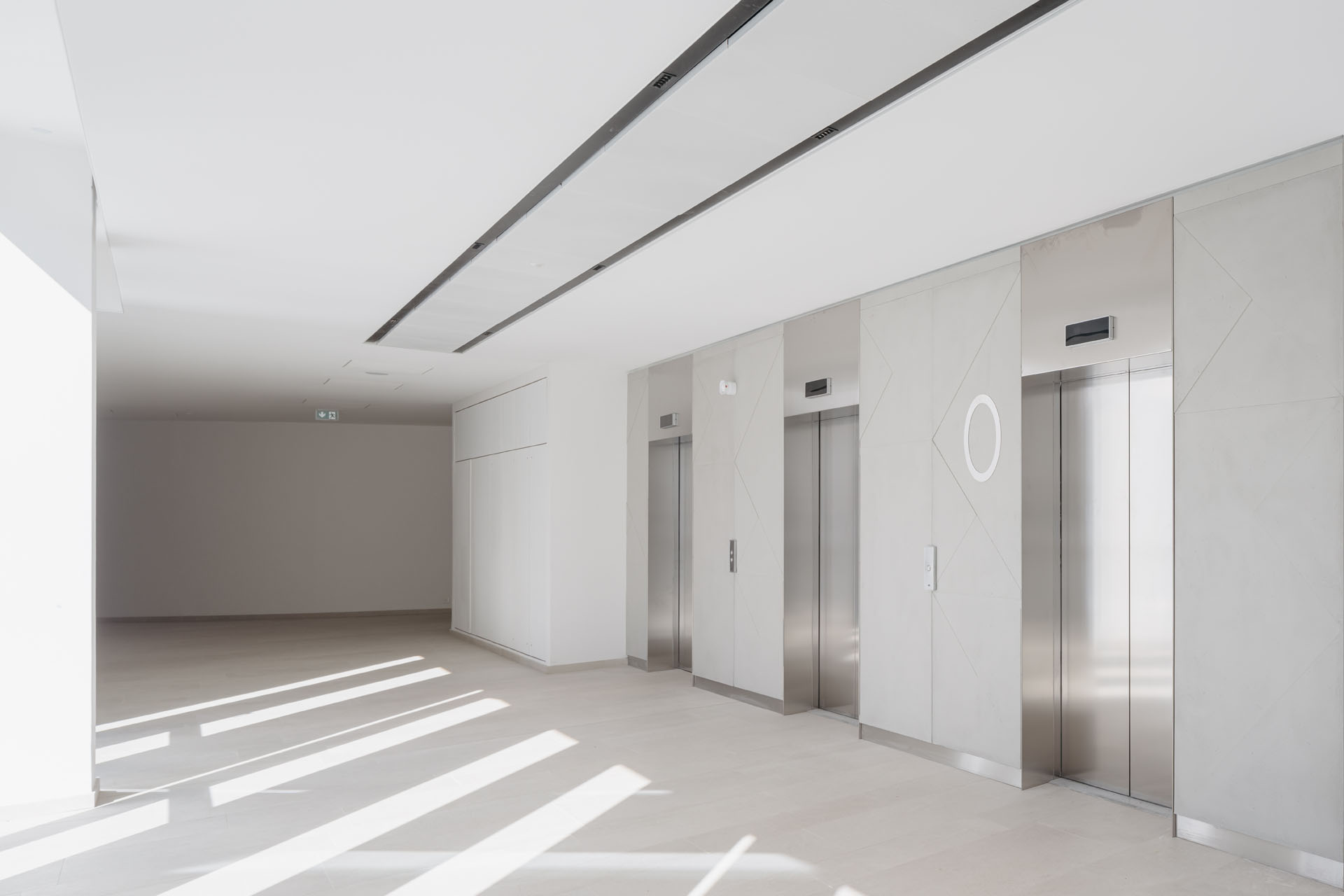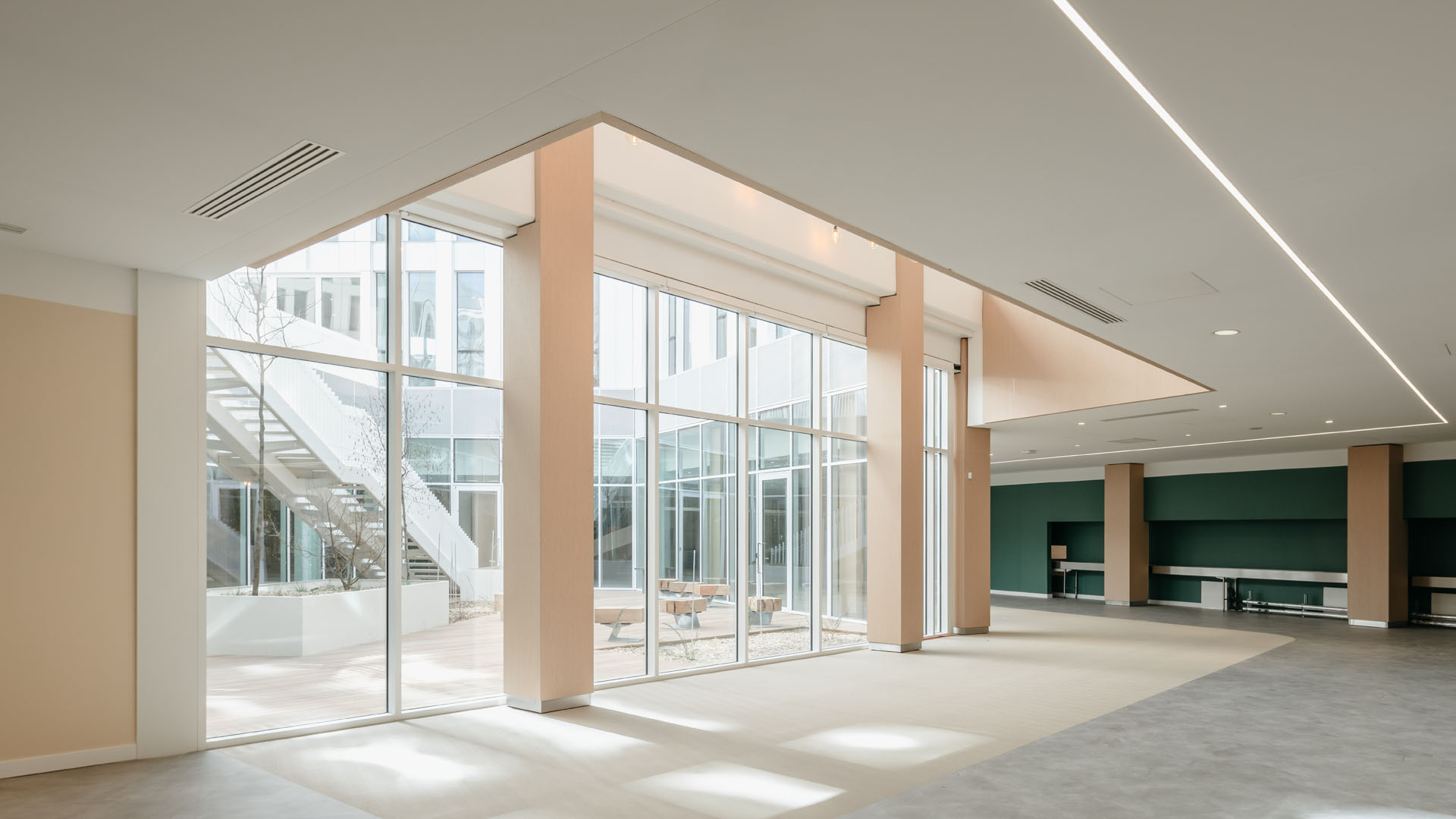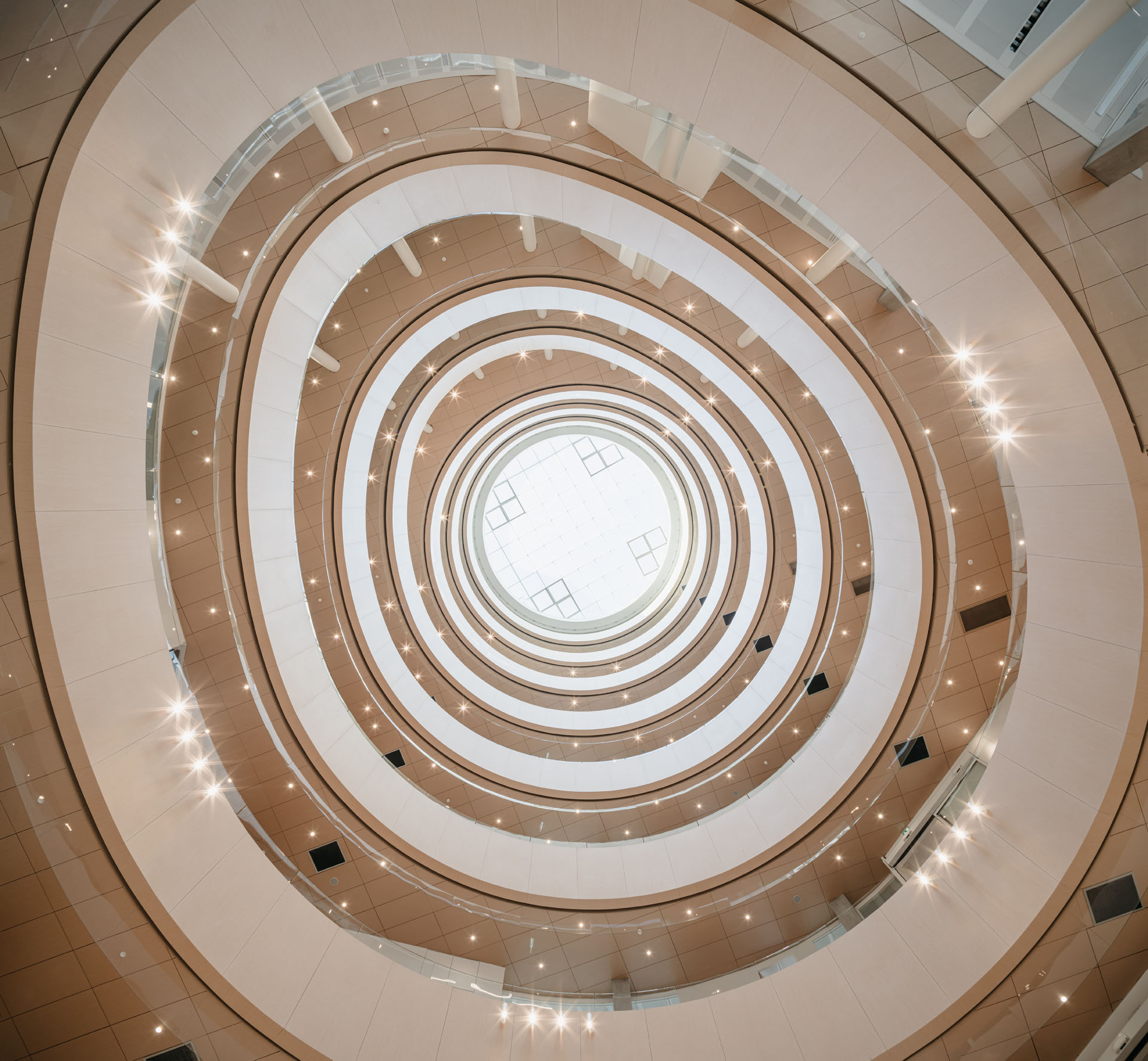 All'interno la grande hall, illuminata da una luce zenitale che penetra dalla cupola vetrata, ricorda gli spazi del Guggenheim di New York, sebbene il percorso ascensionale a spirale sia qui sostituito da balconi circolari. Legno e cemento sono le due componenti strutturali mentre a predominare sono nuance chiare che enfatizzano la luminosità di tutti gli ambienti.