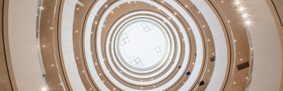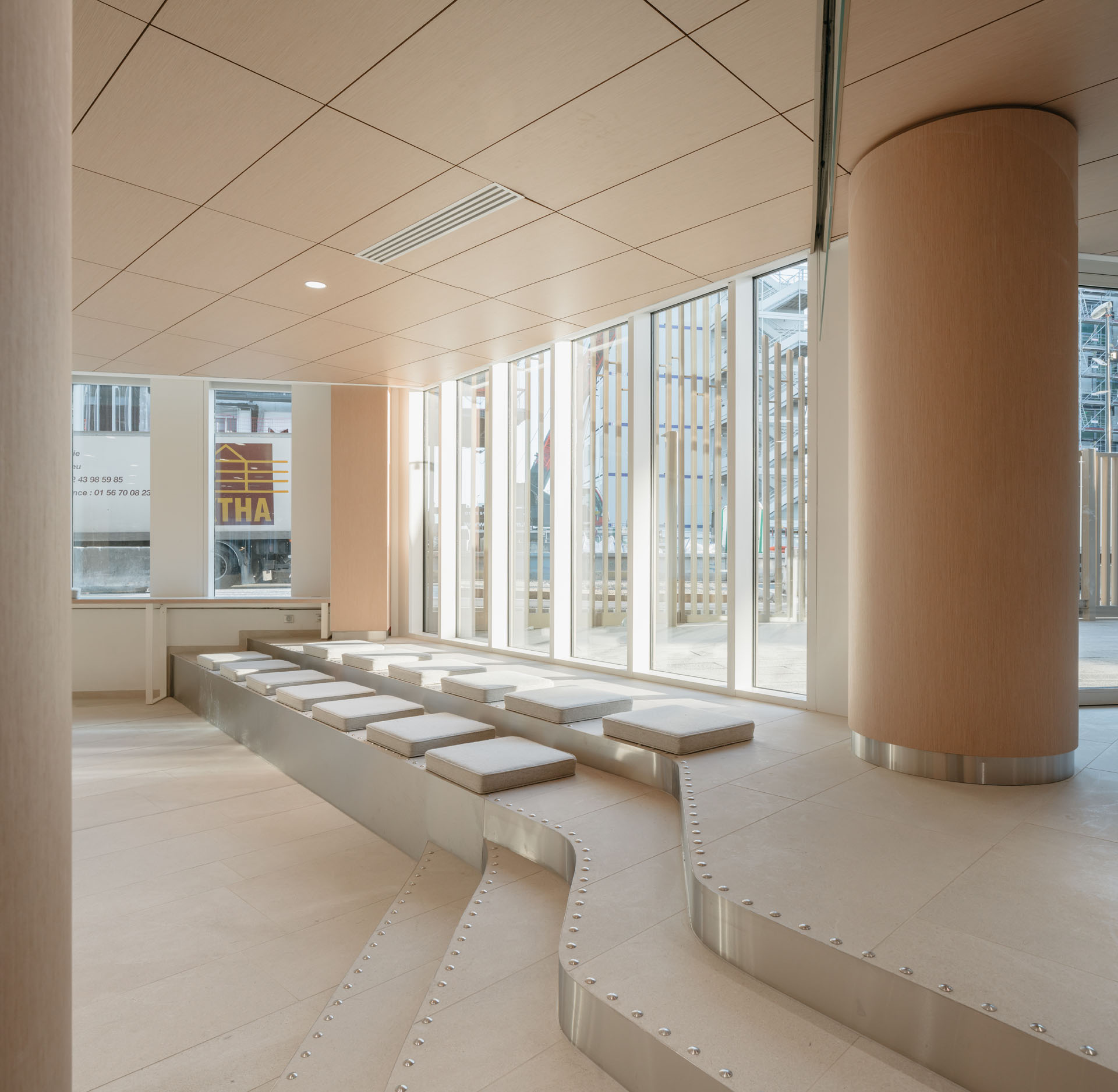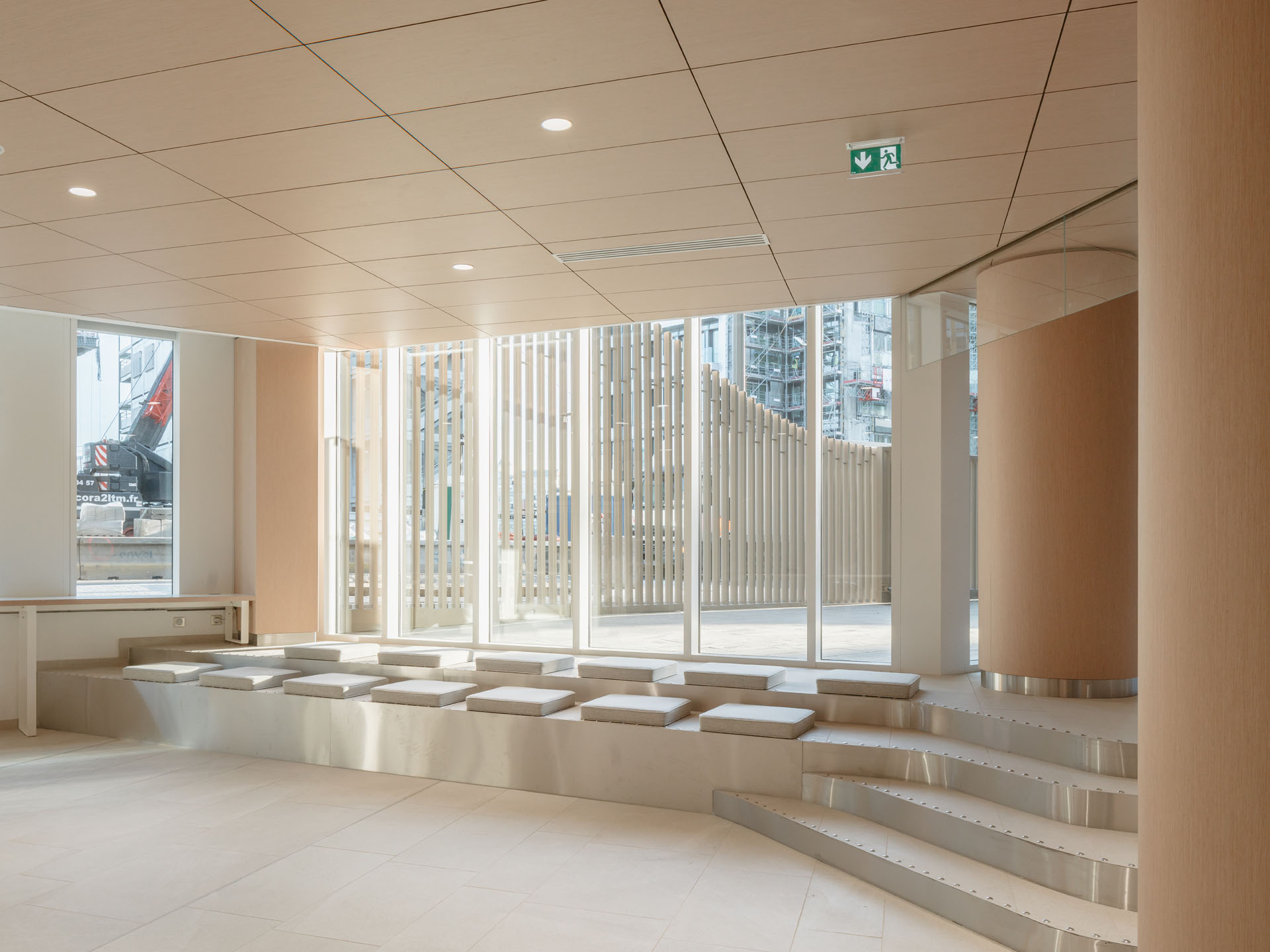 All'interno la grande hall, illuminata da una luce zenitale che penetra dalla cupola vetrata, ricorda gli spazi del Guggenheim di New York, sebbene il percorso ascensionale a spirale sia qui sostituito da balconi circolari. Legno e cemento sono le due componenti strutturali mentre a predominare sono nuance chiare che enfatizzano la luminosità di tutti gli ambienti.