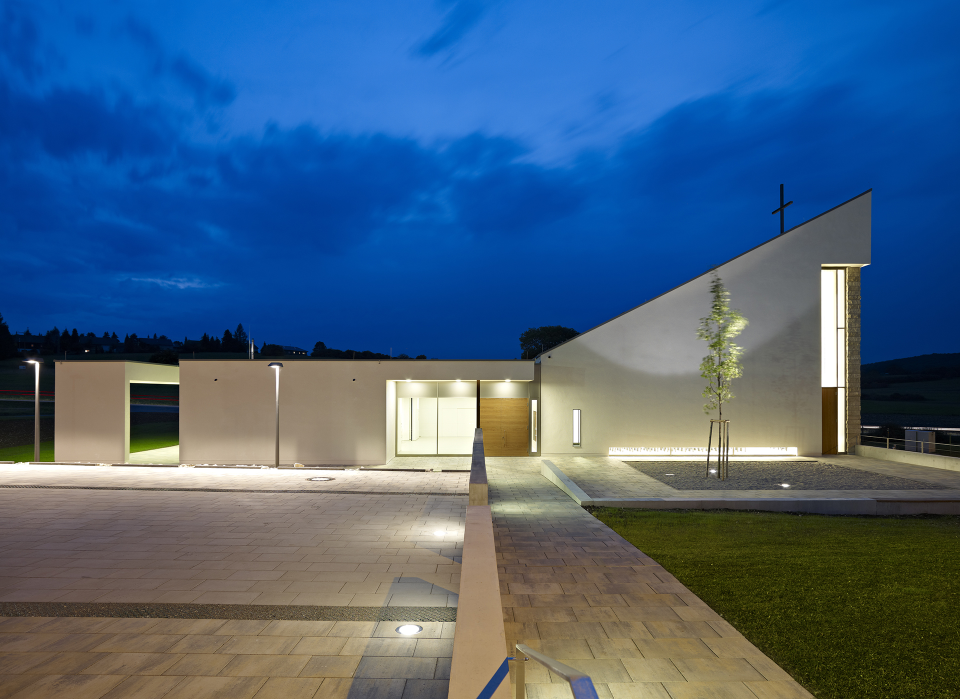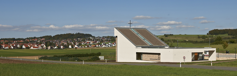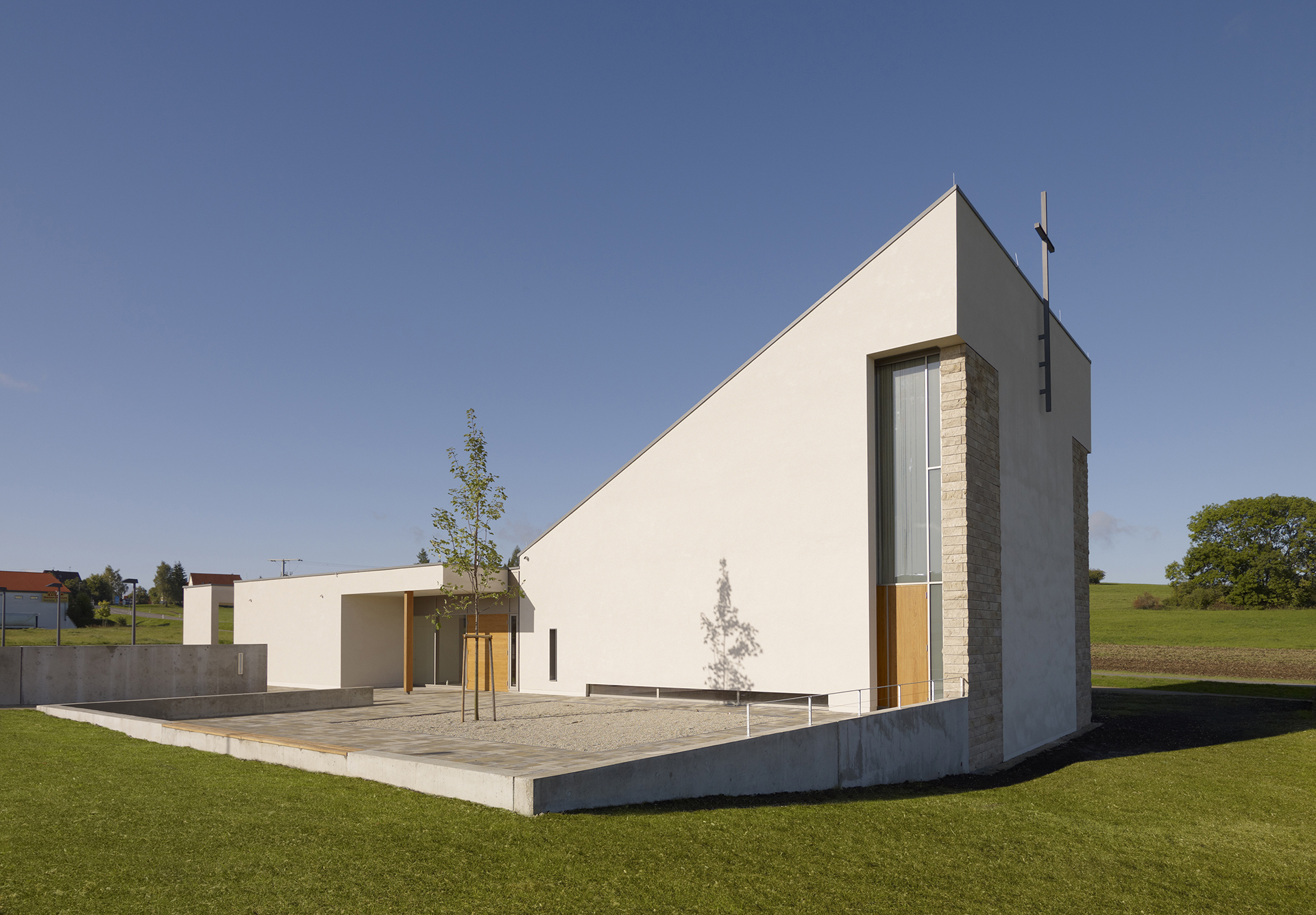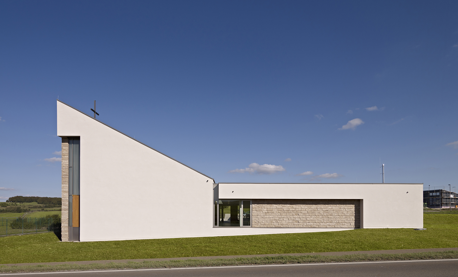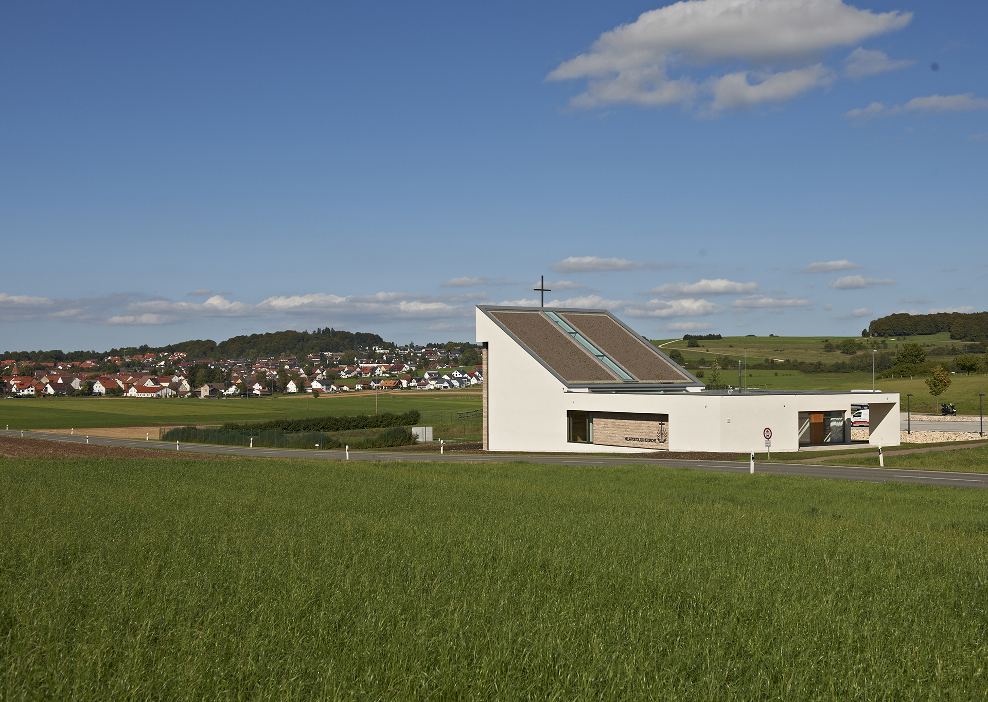 Un volume puro. Anzi, due. Questa, in estrema sintesi, la matrice progettuale della chiesa iper-moderna realizzata dall'architetto tedesco Thomas Bamberg a Sonnenbühl, piccolo comune di 7mila abitanti, situato nel land di Tübingen, in Germania. Un paese fatto di piccole case immerse in un verde paesaggio bucolico, che contrasta in maniera forte con la sagoma della chiesa. Ma, torniamo al progetto. Si tratta di un solido geometrico puro completamente bianco, fatte salve le uniche concessioni al vernacolare (ma un vernacolare assolutamente contemporaneo) riscontrabili nelle superfici ricoperte con pietre a spacco. Un intervento architettonico chiaro e deciso, che interpreta con raffinata sensibilità, ma con decisione, appunto, il tema dell'inserimento nel contesto naturalistico. Caratterizzata da rigore e purezza formale, la costruzione emerge dal paesaggio con un carattere deciso, ma creando un contrappunto armonico. Il prospetto laterale sul lato più lungo, quello che porta alla navata centrale, disegna un parallelepipedo basso che si impenna verso la zona che - all'interno - contiene l'altare; qui, la sagoma assume la forma del triangolo (un'allusione al divino?) e culmina con una croce stilizzata nel suo vertice più alto. Nessun campanile né elementi architettonici ridondanti. Anche le aperture hanno un disegno molto netta. Sembra non ci siano finestre sul fianco della costruzione; solo delle aperture nel volume che invitano i fedeli ad entrare dal fondo e dalle porte laterali. Solo negli spigoli della parte più alta si notano i due serramenti quasi a tutta altezza, che diventano finestroni visti dall'interno della chiesa. In copertura, un taglio netto sul tetto fa piovere la luce dall'alto, inondando l'aula liturgica.