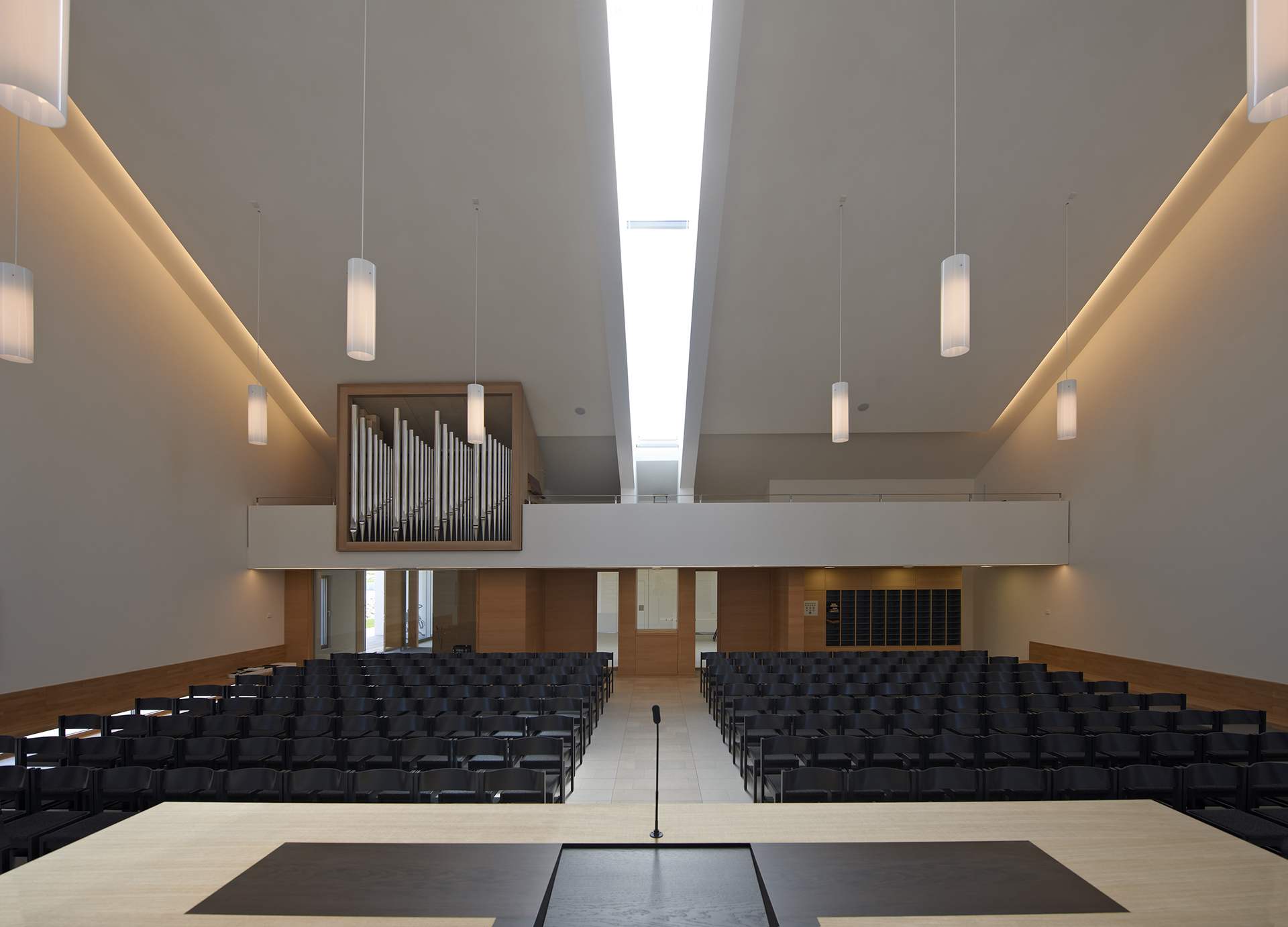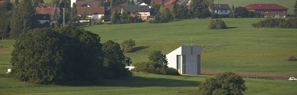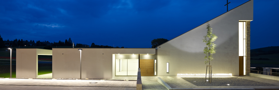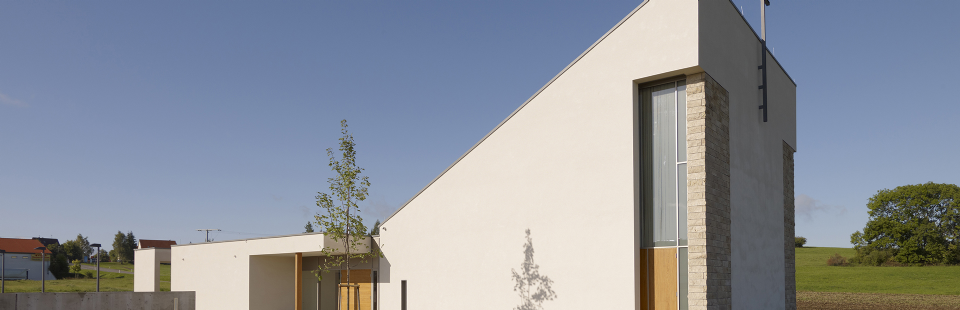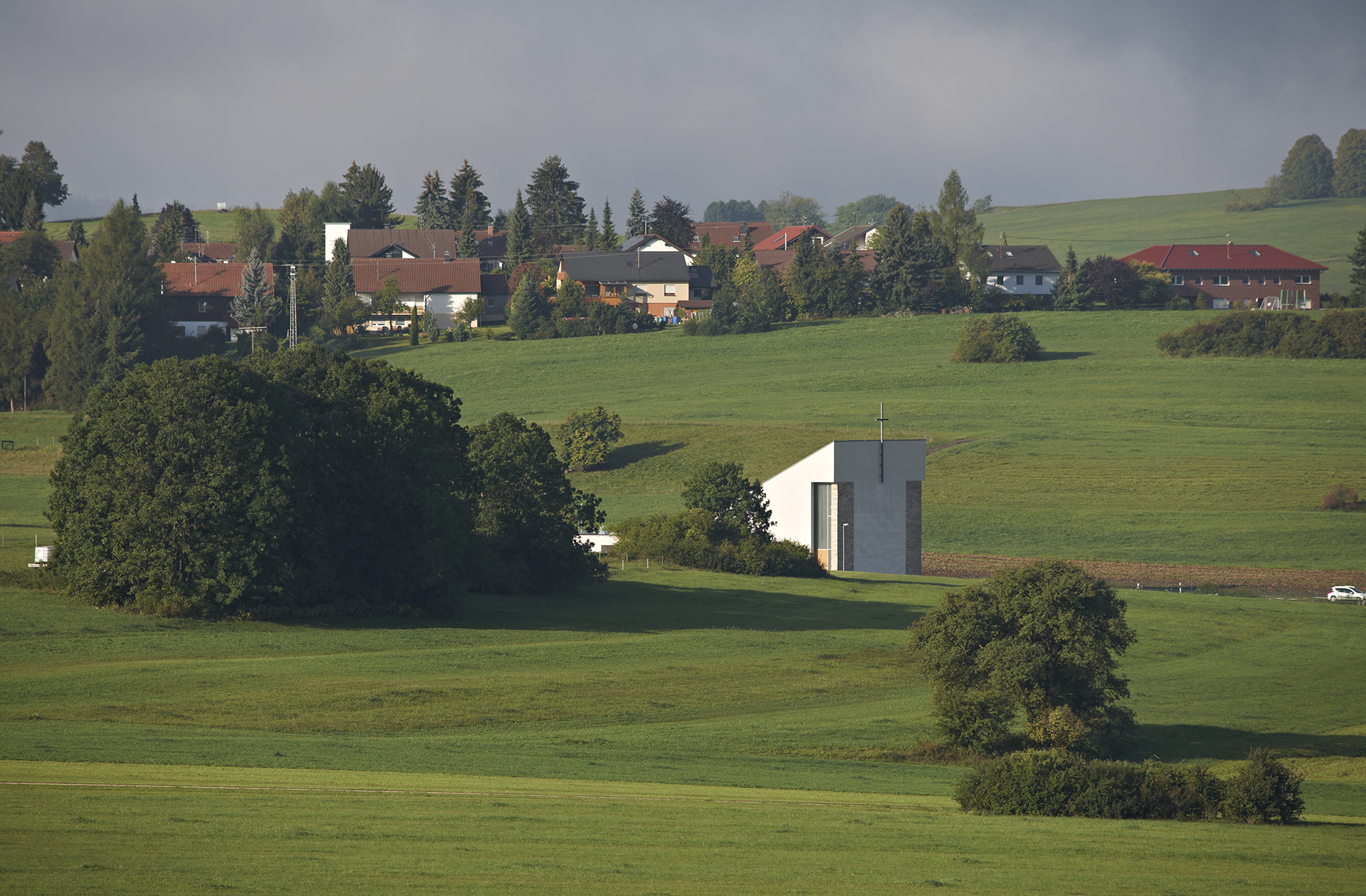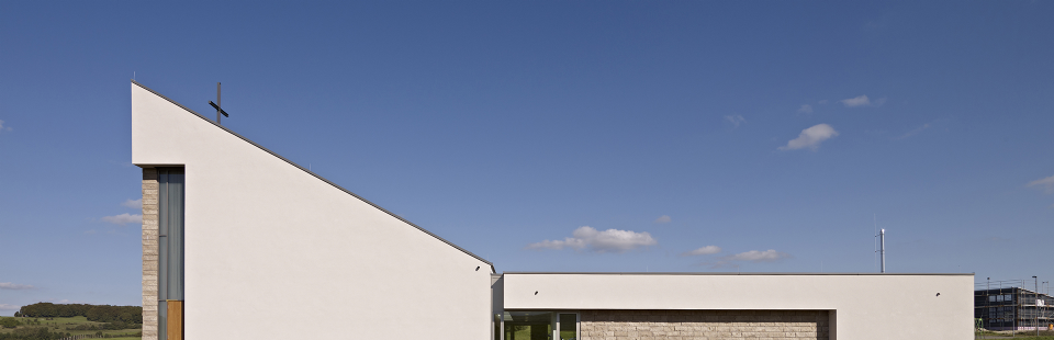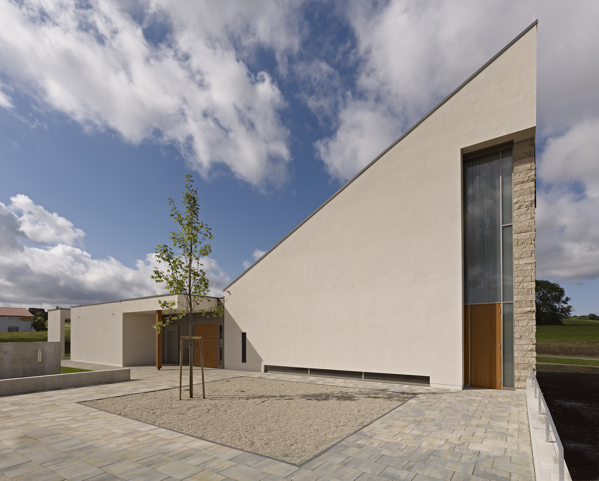 Un volume puro. Anzi, due. Questa, in estrema sintesi, la matrice progettuale della chiesa iper-moderna realizzata dall'architetto tedesco Thomas Bamberg a Sonnenbühl, piccolo comune di 7mila abitanti, situato nel land di Tübingen, in Germania. Un paese fatto di piccole case immerse in un verde paesaggio bucolico, che contrasta in maniera forte con la sagoma della chiesa. Ma, torniamo al progetto. Si tratta di un solido geometrico puro completamente bianco, fatte salve le uniche concessioni al vernacolare (ma un vernacolare assolutamente contemporaneo) riscontrabili nelle superfici ricoperte con pietre a spacco. Un intervento architettonico chiaro e deciso, che interpreta con raffinata sensibilità, ma con decisione, appunto, il tema dell'inserimento nel contesto naturalistico. Caratterizzata da rigore e purezza formale, la costruzione emerge dal paesaggio con un carattere deciso, ma creando un contrappunto armonico. Il prospetto laterale sul lato più lungo, quello che porta alla navata centrale, disegna un parallelepipedo basso che si impenna verso la zona che - all'interno - contiene l'altare; qui, la sagoma assume la forma del triangolo (un'allusione al divino?) e culmina con una croce stilizzata nel suo vertice più alto. Nessun campanile né elementi architettonici ridondanti. Anche le aperture hanno un disegno molto netta. Sembra non ci siano finestre sul fianco della costruzione; solo delle aperture nel volume che invitano i fedeli ad entrare dal fondo e dalle porte laterali. Solo negli spigoli della parte più alta si notano i due serramenti quasi a tutta altezza, che diventano finestroni visti dall'interno della chiesa. In copertura, un taglio netto sul tetto fa piovere la luce dall'alto, inondando l'aula liturgica.