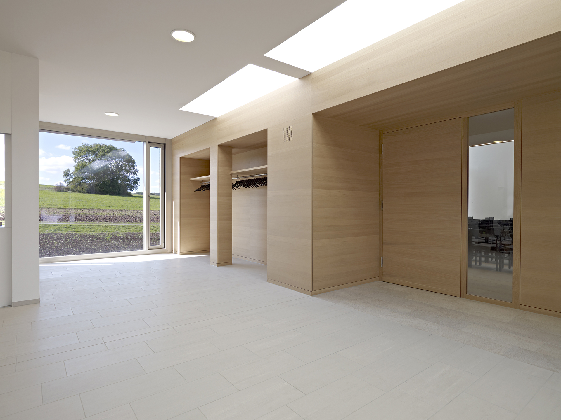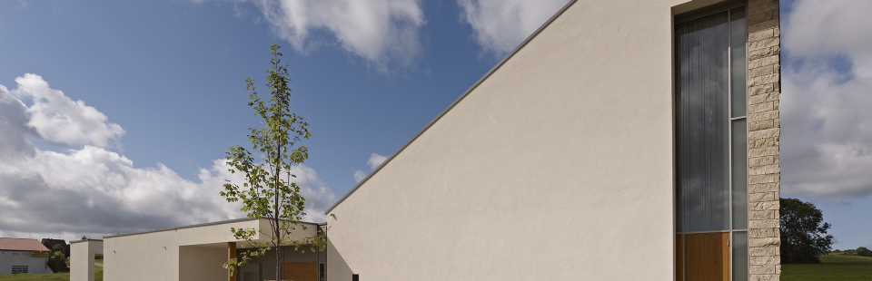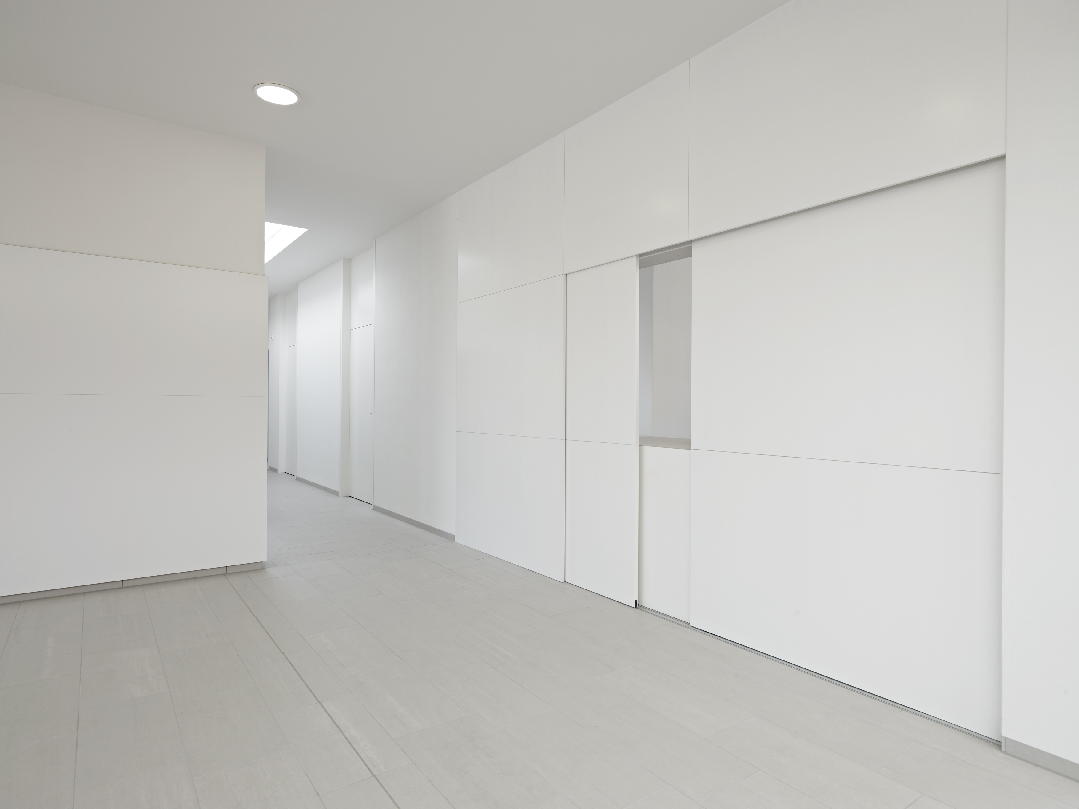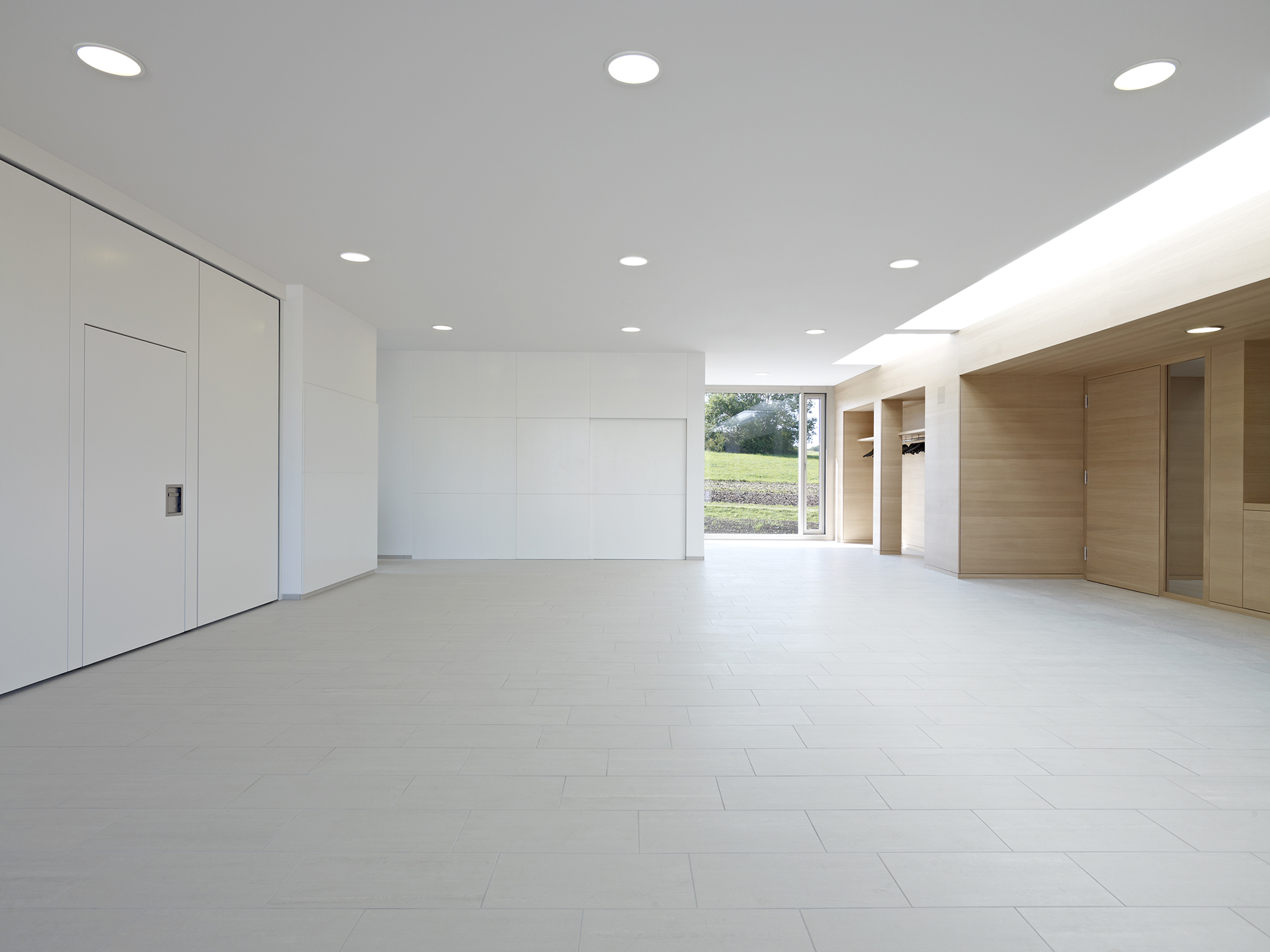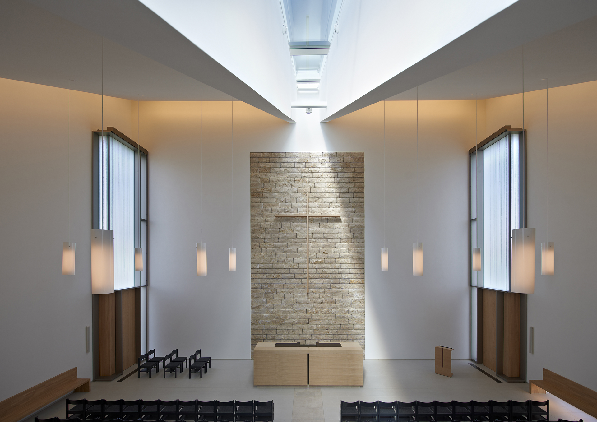 Un volume puro. Anzi, due. Questa, in estrema sintesi, la matrice progettuale della chiesa iper-moderna realizzata dall'architetto tedesco Thomas Bamberg a Sonnenbühl, piccolo comune di 7mila abitanti, situato nel land di Tübingen, in Germania. Un paese fatto di piccole case immerse in un verde paesaggio bucolico, che contrasta in maniera forte con la sagoma della chiesa. Ma, torniamo al progetto. Si tratta di un solido geometrico puro completamente bianco, fatte salve le uniche concessioni al vernacolare (ma un vernacolare assolutamente contemporaneo) riscontrabili nelle superfici ricoperte con pietre a spacco. Un intervento architettonico chiaro e deciso, che interpreta con raffinata sensibilità, ma con decisione, appunto, il tema dell'inserimento nel contesto naturalistico. Caratterizzata da rigore e purezza formale, la costruzione emerge dal paesaggio con un carattere deciso, ma creando un contrappunto armonico. Il prospetto laterale sul lato più lungo, quello che porta alla navata centrale, disegna un parallelepipedo basso che si impenna verso la zona che - all'interno - contiene l'altare; qui, la sagoma assume la forma del triangolo (un'allusione al divino?) e culmina con una croce stilizzata nel suo vertice più alto. Nessun campanile né elementi architettonici ridondanti. Anche le aperture hanno un disegno molto netta. Sembra non ci siano finestre sul fianco della costruzione; solo delle aperture nel volume che invitano i fedeli ad entrare dal fondo e dalle porte laterali. Solo negli spigoli della parte più alta si notano i due serramenti quasi a tutta altezza, che diventano finestroni visti dall'interno della chiesa. In copertura, un taglio netto sul tetto fa piovere la luce dall'alto, inondando l'aula liturgica.