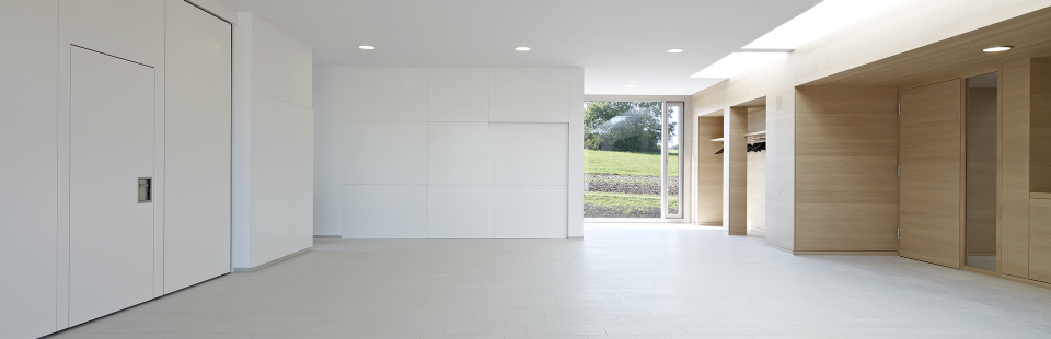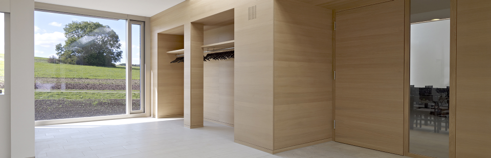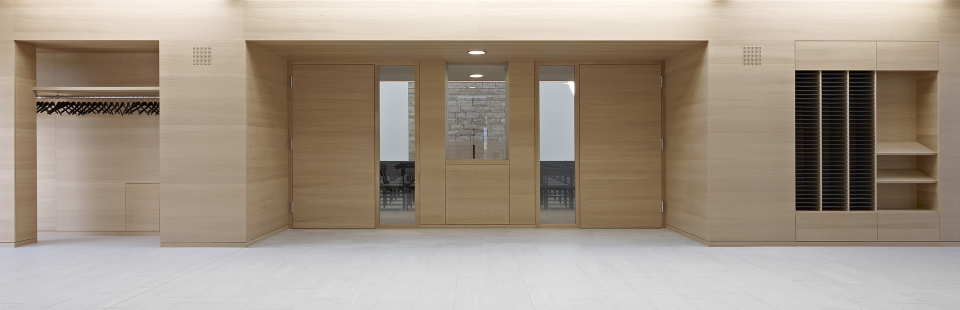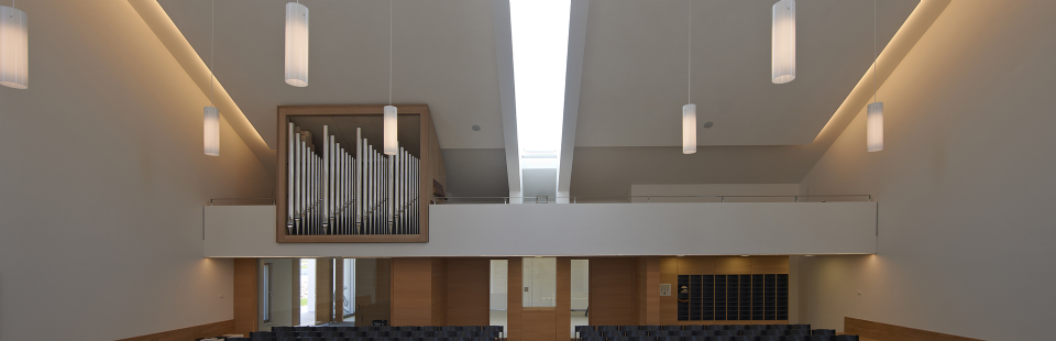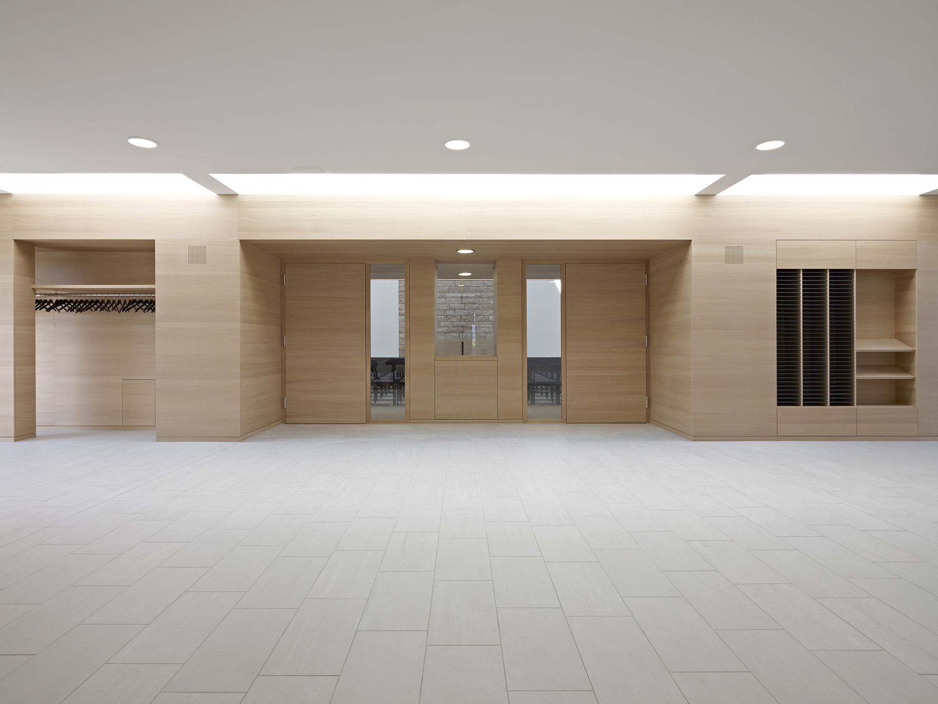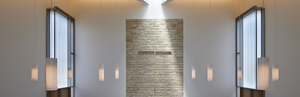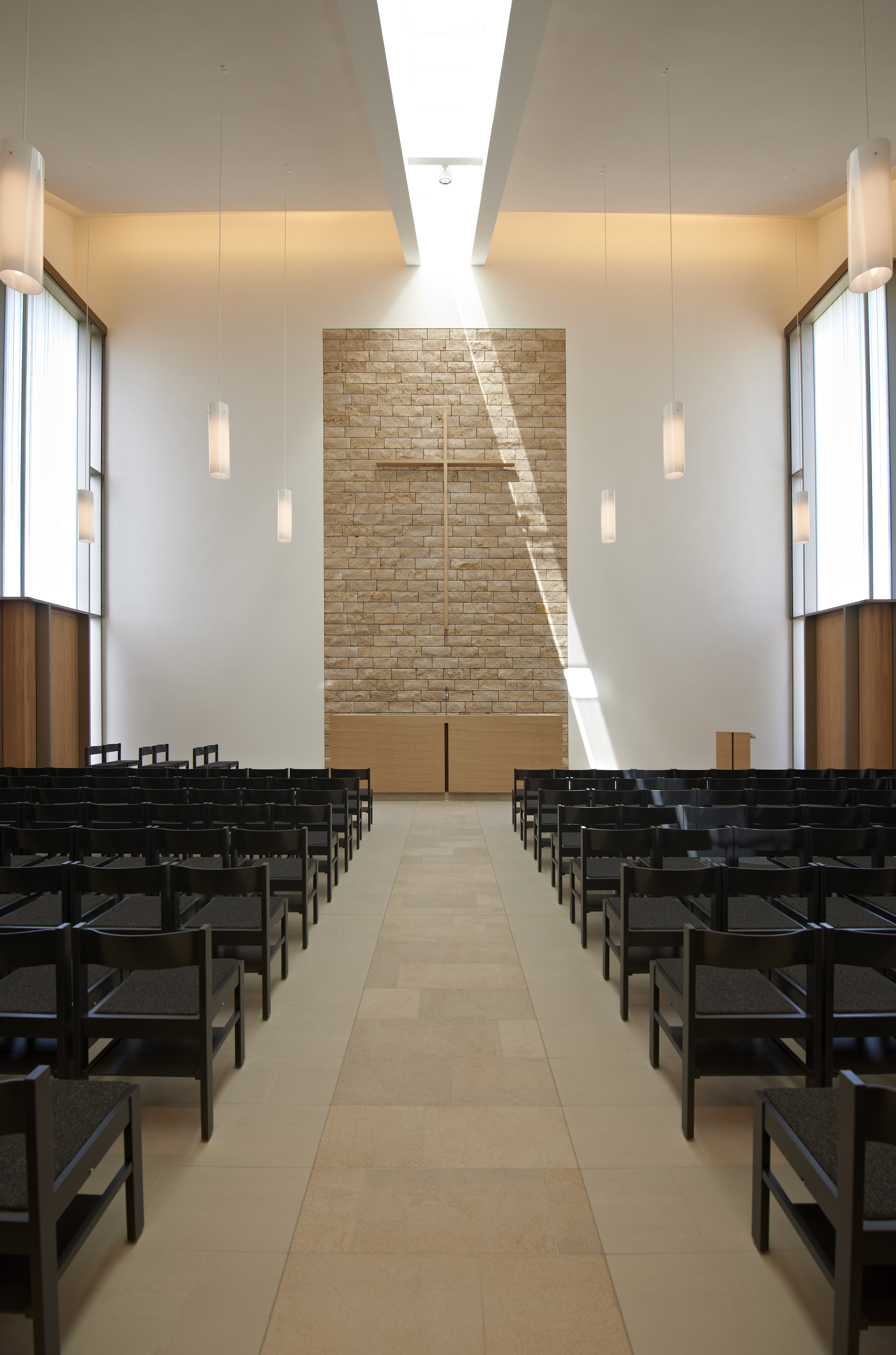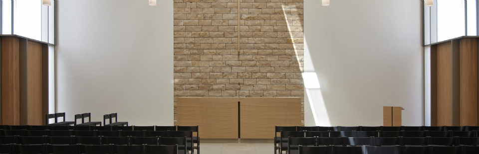 La continuità cromatica tra esterno e interno è garantita dalla omogeneità materica. Una continuità realizzata con la pavimentazione ceramica delle parti comuni antistanti l'ingresso sia nello spazio dedicato alle funzioni vero e proprio. Qui, l'equilibrio raggiunto nella definizione della spazialità tra e il piano del pavimento è risolto con l'impiego deciso ma discreto delle lastre in gres porcellanato applicate secondo un preciso schema di posa. Schema che nel corridoio centrale tra i due ordini di panche presenta un segno diverso, che idealmente invita ad andare verso l'altare per il momento dell'eucarestia. Il materiale utilizzato è prodotto da Casalgrande Padana, collezione Marte, Mineral Chrom, Grigio Egeo e Mineral Beige, nel formato 30X60 cm, abbinato alla pietra naturale a spacco e al legno chiaro. La scelta coerente dei materiali e dei colori - tutti giocati su toni neutri abbinati al colore candido delle pareti - assume un ruolo fondamentale e costituisce un elemento distintivo a livello compositivo nella determinazione della qualità ambientale. Il tutto, alla ricerca dell'armonia e della semplicità. Temi legati in maniera indissolubile al luogo di culto.
