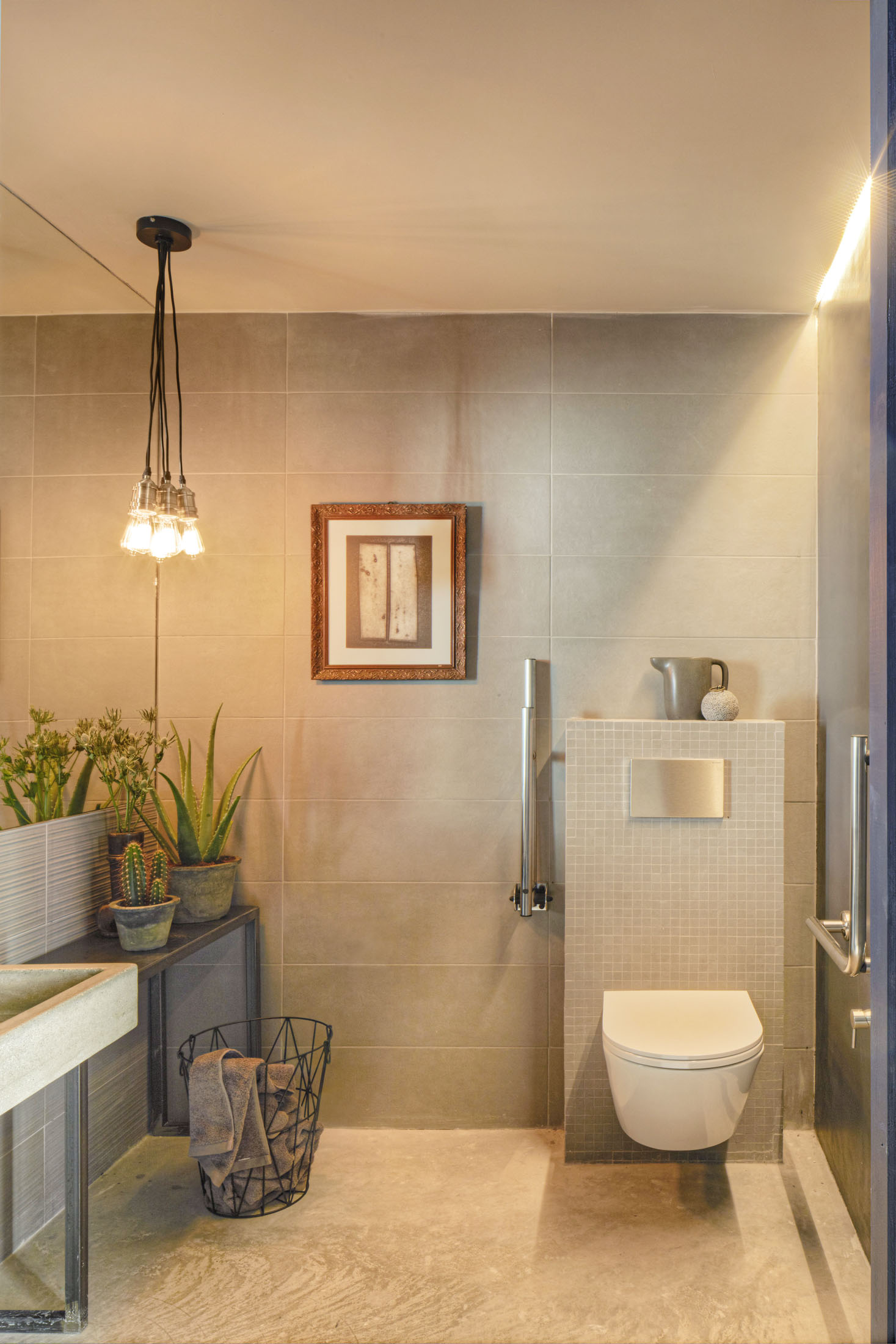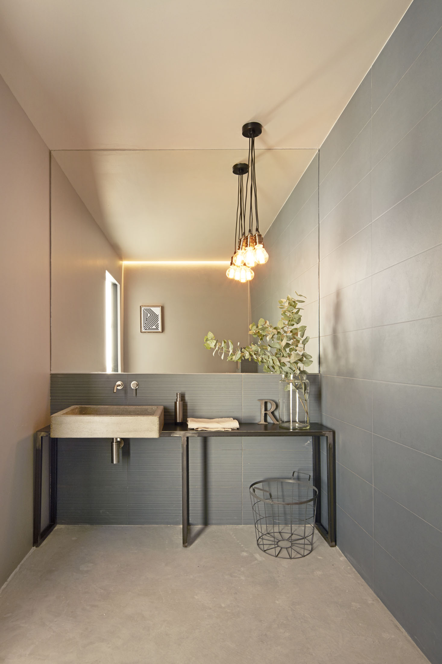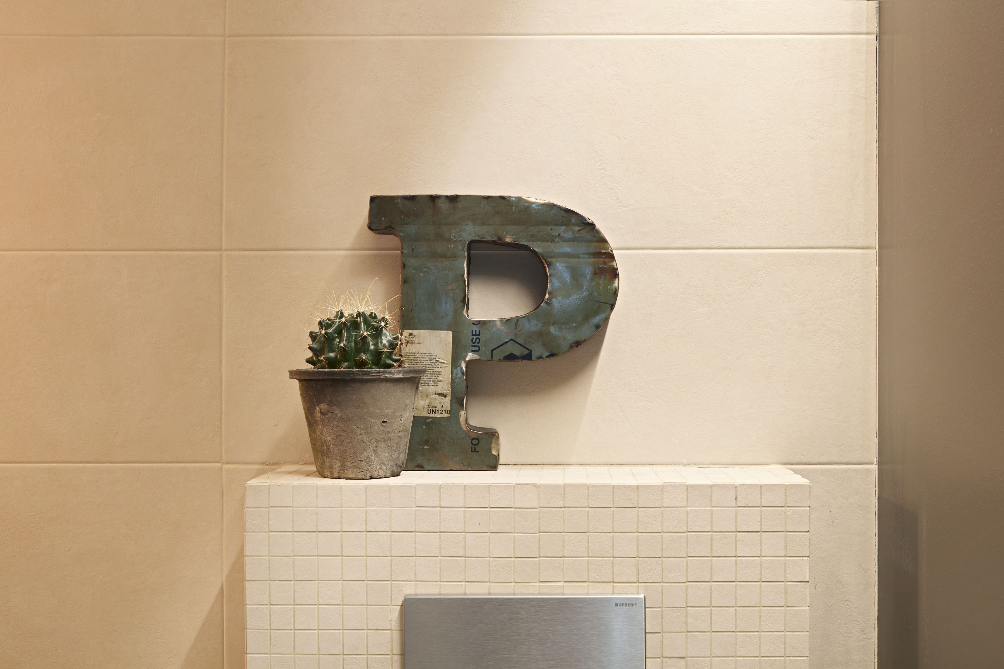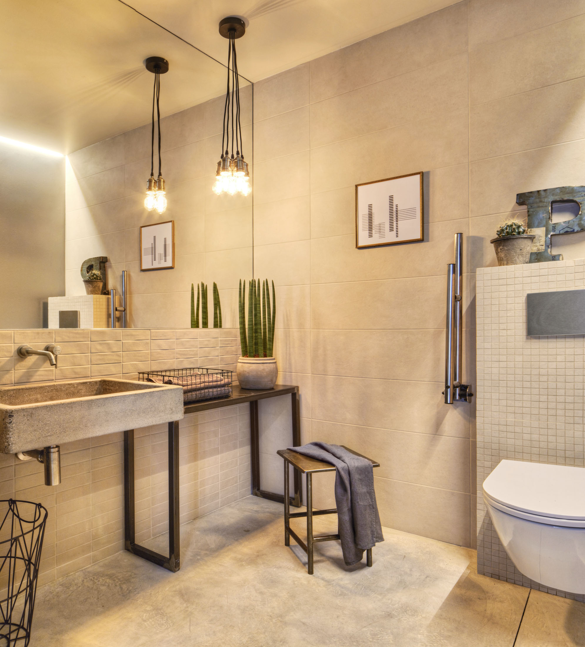 A centrare tale obiettivo lasciando comunque anche ai servizi quel carattere industriale semplice e rigoroso, e insieme elegante e easy che connota l'intero complesso, ha contributo anche la scelta dei rivestimenti ceramici. Lo studio di progettazione si è, a tal proposito, orientato sulla collezione ”a effetto cemento”, vagamente brutalista, Chalk di Marazzi, declinata nelle tinte Smoke, Avio e Sand, e con le due strutture 3D Fiber e Brick. Alle pareti le lastre sono state posate in orizzontale con l'intento di dare agli ambienti, di per sé assai ridotti, un maggior senso di profondità e ordine peraltro acuito dall'effetto chiaroscurale del 3D. A completare la scena e a suggellare l'attenzione dell'intervento per il dettaglio è la raffinata fodera del volume squadrato che funge da schienale per il sanitario: il mosaico Chalk qui impiegato negli stessi colori dei rivestimenti.