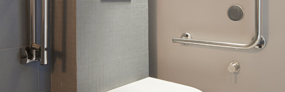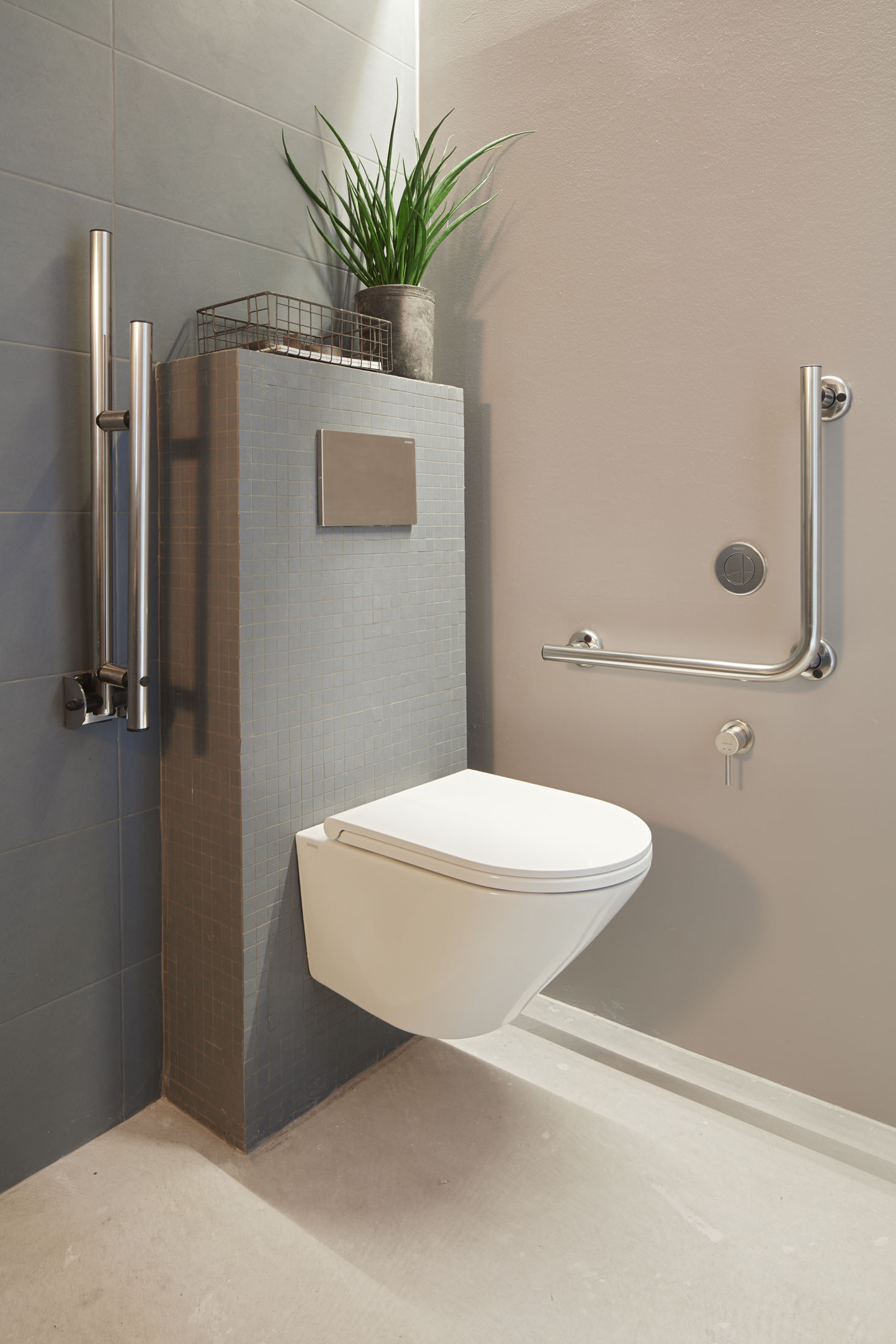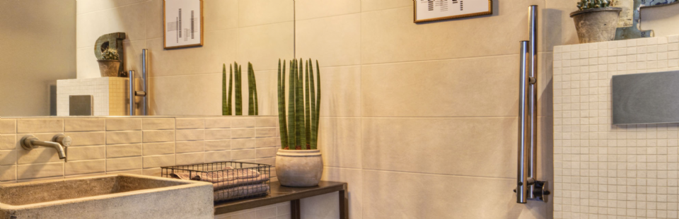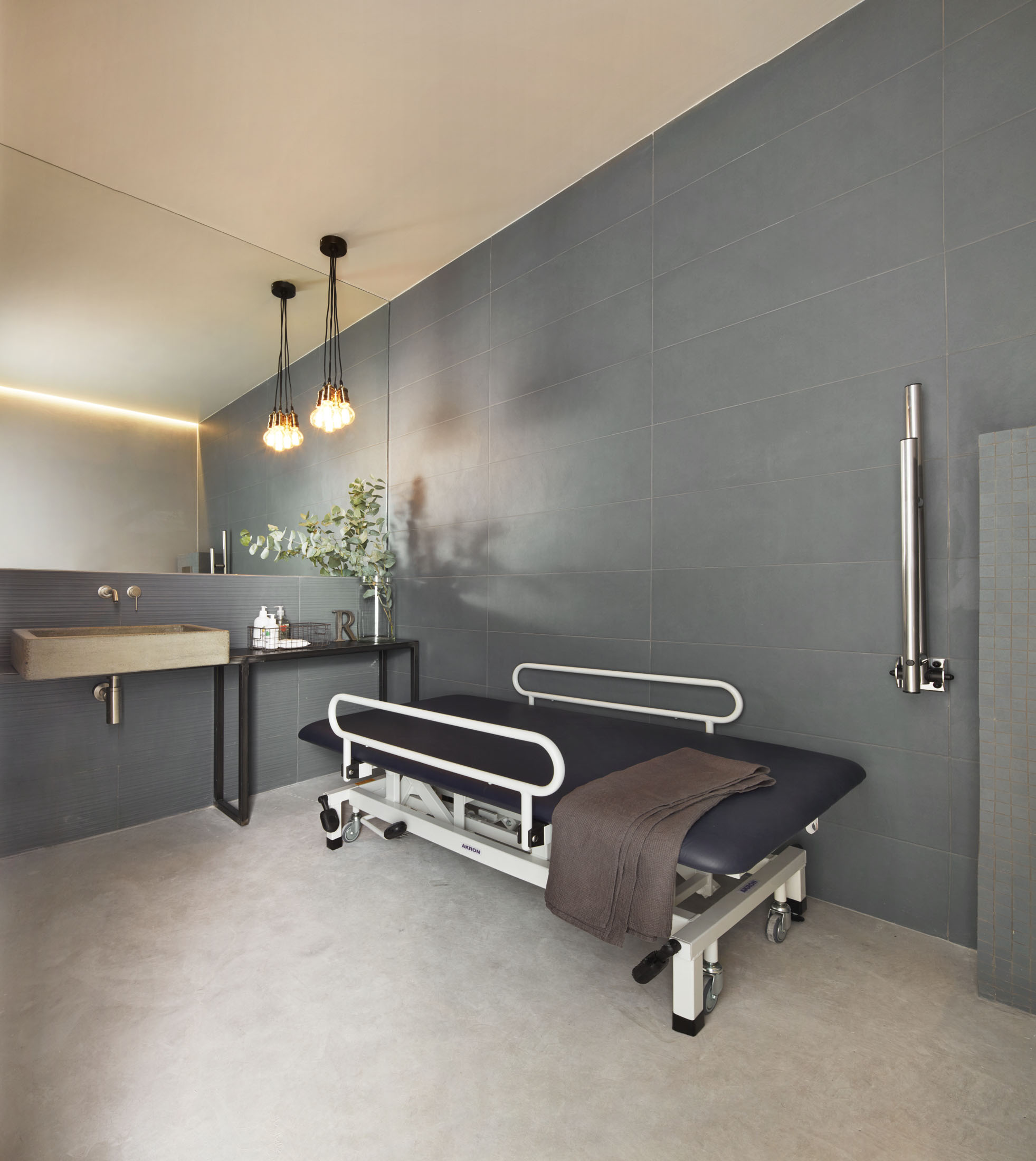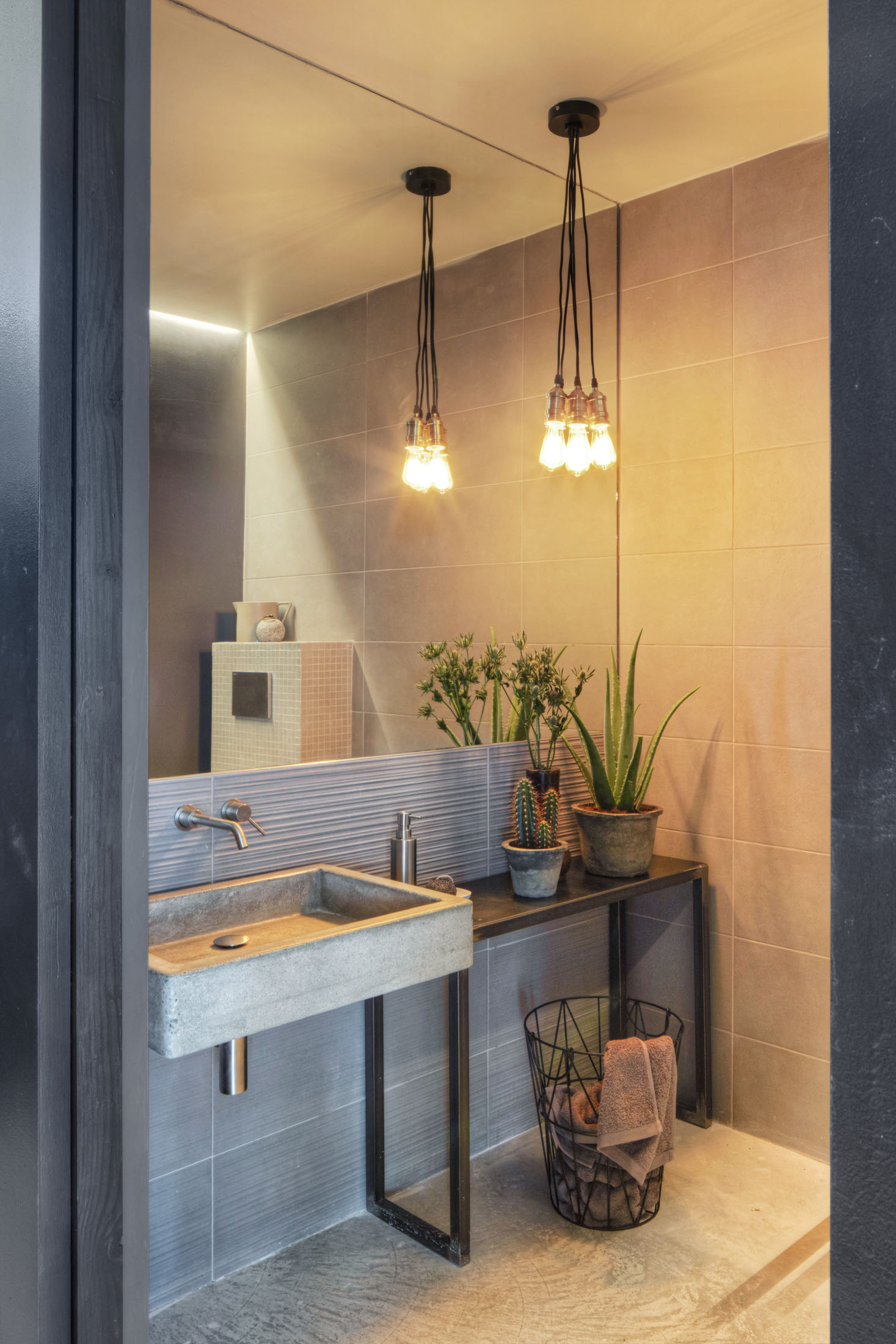 A centrare tale obiettivo lasciando comunque anche ai servizi quel carattere industriale semplice e rigoroso, e insieme elegante e easy che connota l'intero complesso, ha contributo anche la scelta dei rivestimenti ceramici. Lo studio di progettazione si è, a tal proposito, orientato sulla collezione ”a effetto cemento”, vagamente brutalista, Chalk di Marazzi, declinata nelle tinte Smoke, Avio e Sand, e con le due strutture 3D Fiber e Brick. Alle pareti le lastre sono state posate in orizzontale con l'intento di dare agli ambienti, di per sé assai ridotti, un maggior senso di profondità e ordine peraltro acuito dall'effetto chiaroscurale del 3D. A completare la scena e a suggellare l'attenzione dell'intervento per il dettaglio è la raffinata fodera del volume squadrato che funge da schienale per il sanitario: il mosaico Chalk qui impiegato negli stessi colori dei rivestimenti.