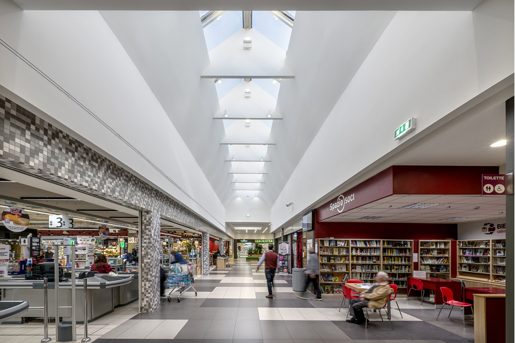 Mentre a Poggibonsi (8.500 mq) il progetto si è concentrato sulla revisione degli ingressi, per cui si è ricorsi alla grafica, al verde e alla posa di materiali come vetro e legno, e sulla razionalizzazione degli interni, ”Le Grondaie” di Siena (6.100 mq) ha richiesto interventi più puntuali all'esterno (sul verde e l'arredo per rendere lo spazio più ”urbano” e accogliente) e all'interno (dove sono stati inseriti elementi per il controllo del rumore nelle gallerie). Il centro di Castelfiorentino (4.000 mq) ha visto un nuovo involucro retroilluminato di pannelli metallici forati sovrapporsi all'esistente e l'introduzione di palette di colori modulati sulle cromie del paesaggio, affiancati da un intervento sulla luce naturale. Svecchiare un'immagine e un edificio datati è stata invece l'azione alla base del progetto di rinnovamento impostato a Borgo San Lorenzo (8.000 mq), che ha fatto leva sui materiali e sulla razionalizzazione della luce. Il centro di Agliana (11.000 mq), infine, ha avuto un progetto che ha agito soprattutto all'interno, dove un nuovo e più connotato controsoffitto accompagna i visitatori lungo le gallerie, nuovi frangisole aiutano nel controllo della luce naturale e una nuova piazza crea uno spazio di incontro e sosta.
