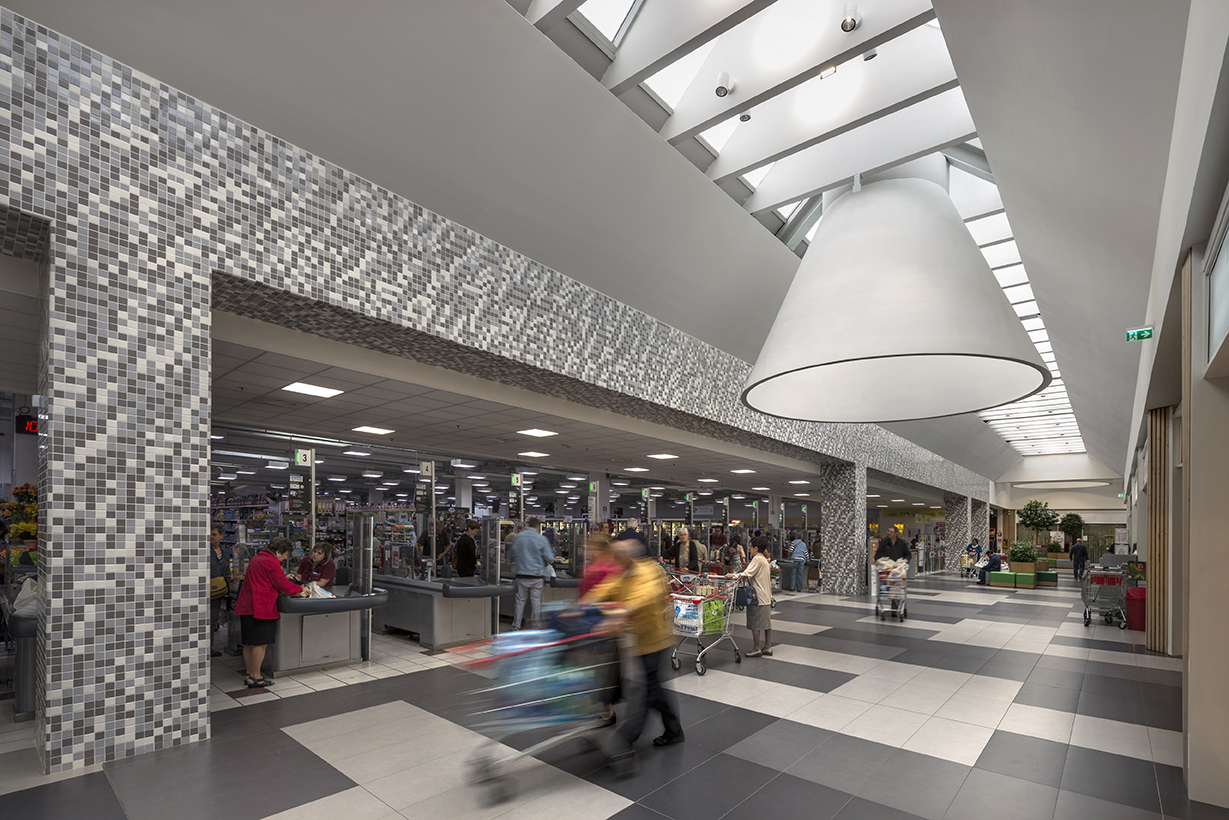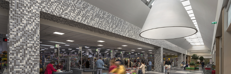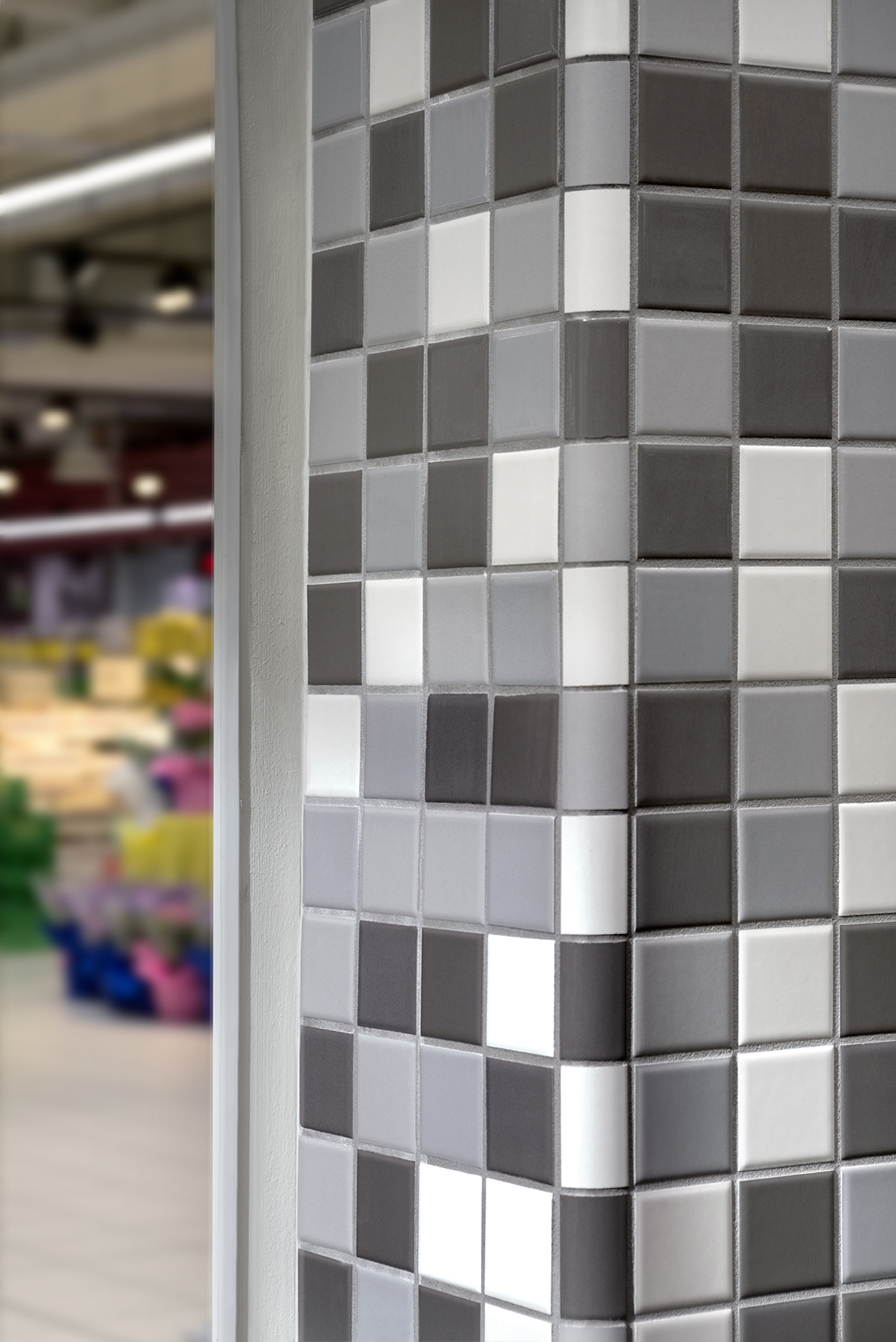 In tutti e cinque, il grés porcellanato italiano di Ceramica Vogue è stato utilizzato per soddisfare uno dei requisiti prioritari per interni belli ma anche durevoli e di qualità: piastrelle quadrate 5x5 formano infatti un mosaico colorato che ricopre le gallerie interne, rinnovando e rendendo più contemporaneo ogni centro.